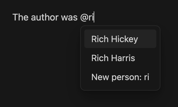 - Backlink-based ranking — people you reference often appear higher in suggestions, with a slight recency boost for recently edited notes