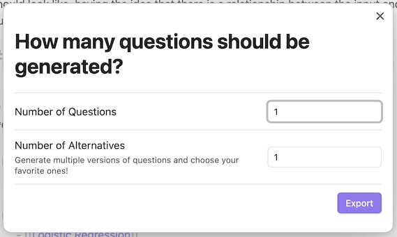 Alternatively, you can also specify the number of alternatives to generate for each question. This allows you more variety in the "questions and answers" generated by GPT and it allows you to choose among a larger number of alternative "questions and answers". Choosing a number of alternatives work best with smaller notes.