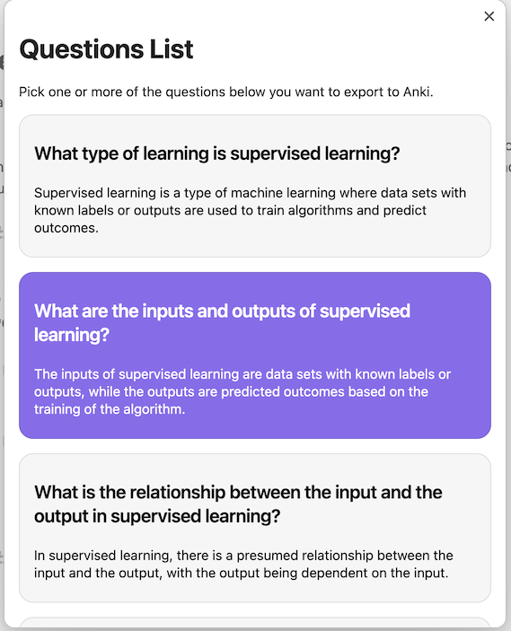 After picking and choosing, your selected "questions and answers" automatically imports the chosen questions to Anki, based on the details in your Plugin settings.