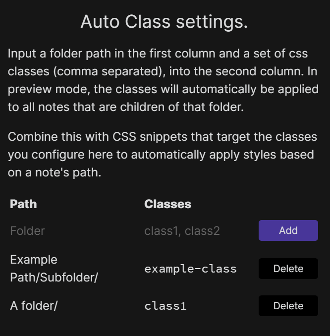 Classes can be applied based on a note's path or tags. In settings, configure a folder path or tag and the classes to apply to the children of that folder or the files with that tag. For advanced use-cases, enable glob matching in settings.