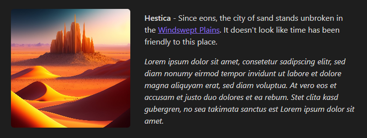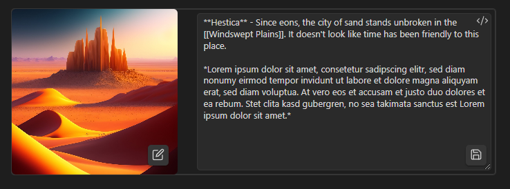 In live preview mode, click on the image to change it (then either select one from your vault, or paste in a URL to a picture online), or edit the description by clicking on it (Don't forget to click the button to save your changes!)