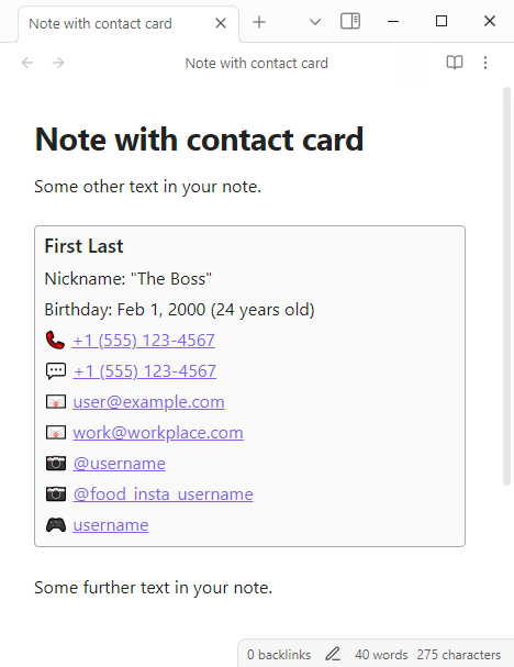You may provide Discord username(s); or, if you would like a convenient link to directly to your DM with that user (works on Desktop and Mobile), you can further provide that channel ID after a pipe symbol. Angle brackets surrounding this pair are optional. For how to obtain the channel ID, please reference https://wiki.discord.id/obtain-ids/desktop. In the "Beautiful Contact Cards" community plugin settings you can decide whether you want links to open in your native client or a browser.