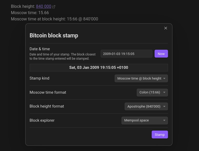 Stamp your notes with the Bitcoin block height and Moscow time. Add the latest stamp or the stamp for any time in the past up to the Genesis block.
