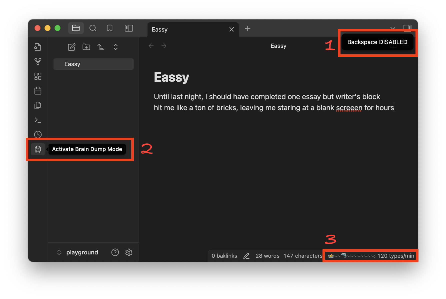 Done is better than perfect. Brain Dump Mode helps you complete your first messy draft without the temptation to edit. Once activated, your delete key will be DISABLED, forcing you to keep writing and just burn your keyboards 🔥.