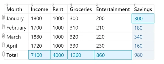| Month | Income | Rent | Groceries | Entertainment | Savings |