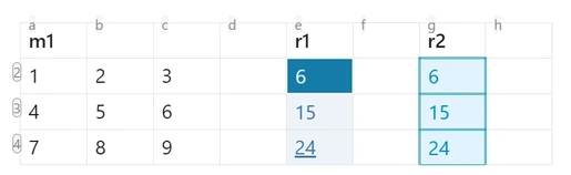 | 1 | 2 | 3 | =[a2:c4]*[1,1,1] | =sum(a+0r:c+0r) | |||