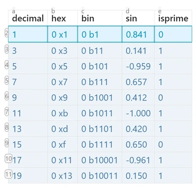 | =transpose(range(1,20,2)) | =map([a:a],hex) | =map([a:a],bin) | =map([a:a],sin) | =map([a:a],isPrime) |