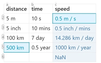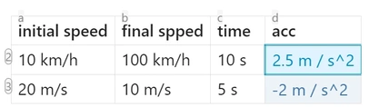 | 10 km/h | 100 km/h | 10 s | =([b:b]-[a:a])./[c:c] |