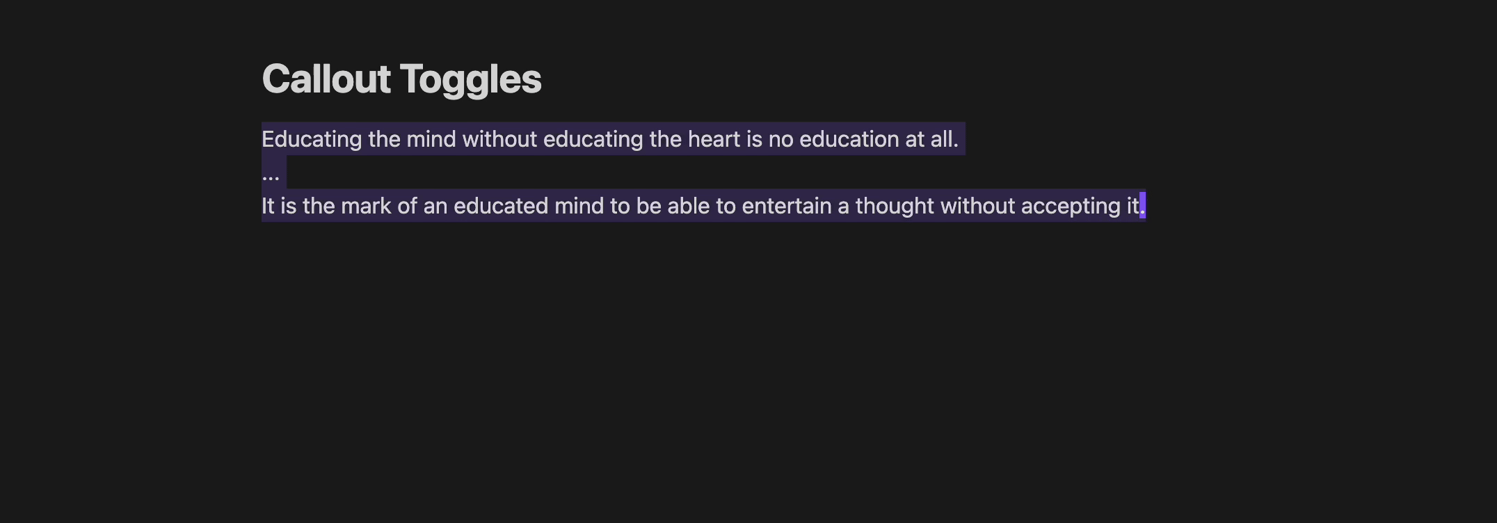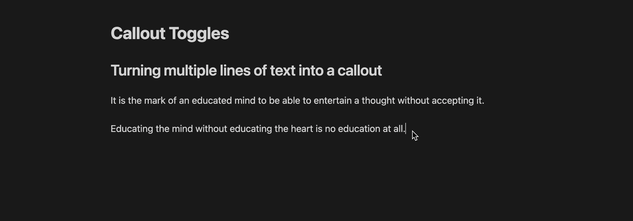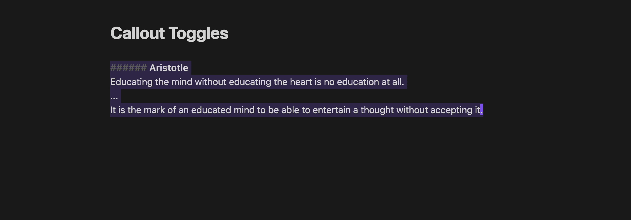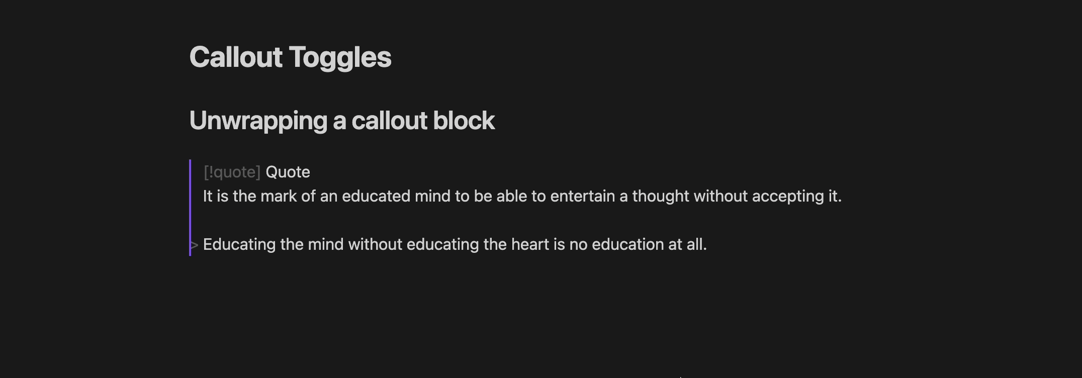 This will remove the callout syntax from the selected lines, turning the callout back into regular text. If a custom title is present, it will be retained as a Markdown heading (see Retaining custom titles).