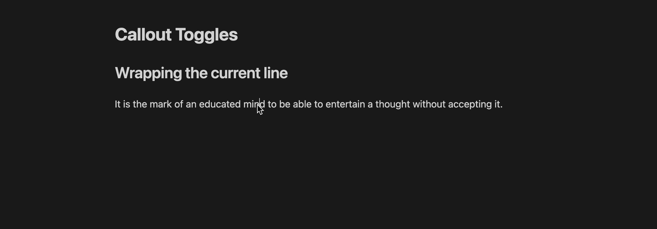 One Wrap lines in ... callout command is provided for every possible callout type (β Quote, β Warning, π₯ Tip, π Bug, π Note, etc.), so that you can assign separate hotkeys for each of your favorite callouts. This can be used both for inserting fresh callouts, and for turning existing text into callouts.