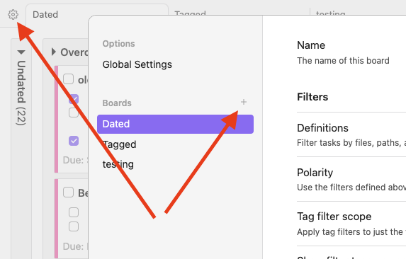 You can filter which tasks appear on each board in the board settings. There are 3 types of filter you can use: file, path, and #tags (which includes tags in note properties). You can use any combination of these on a per-board basis.