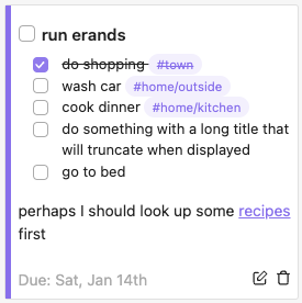 #tagson the line of the task or included in thetagsproperty of the note containing the task will appear at the top of the card- Due date (if given) will appear at the bottom of the card.