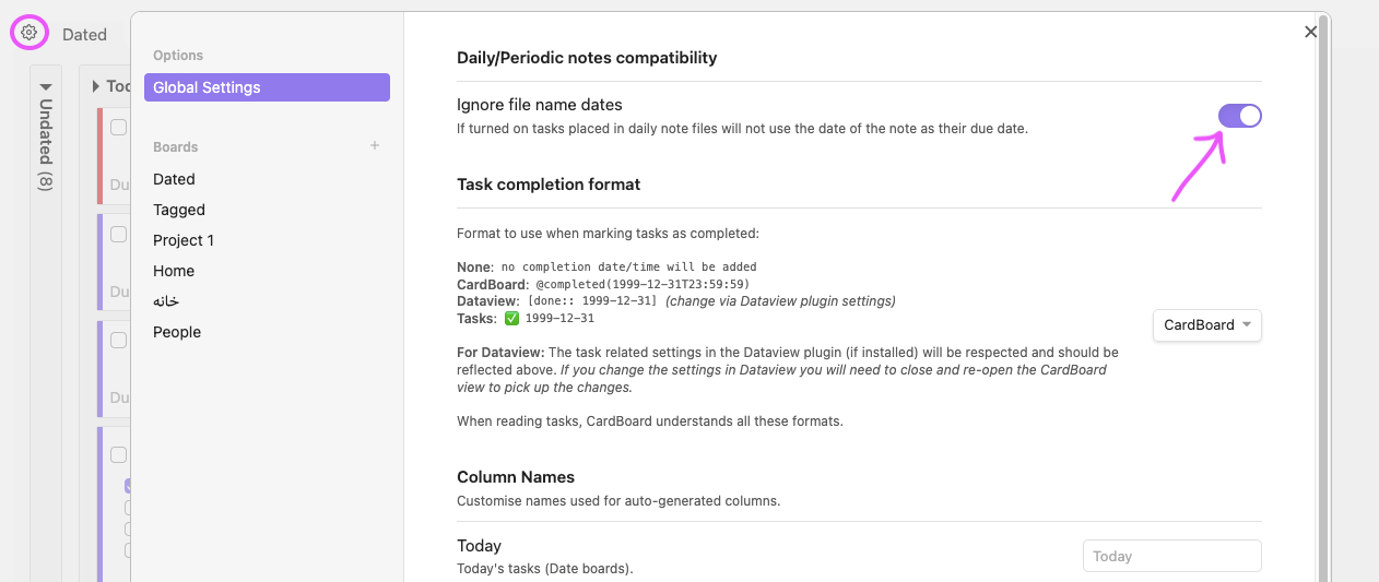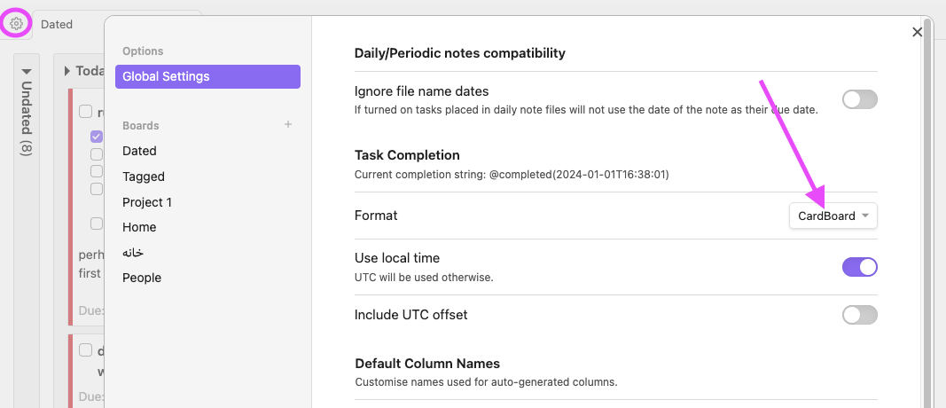 - Choose whether to use Cardboard, Dataview or Tasks format for marking task completion.