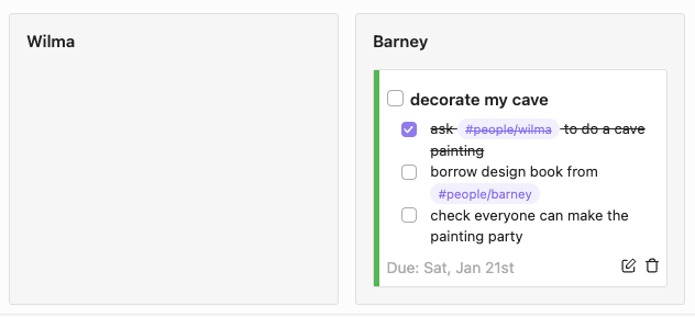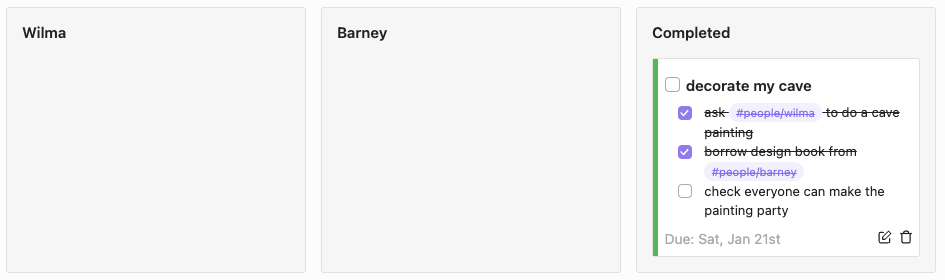 This does mean that a card can appear in the completed column even if the top level task is not complete, e.g for the above example if the Barney task is marked as complete the card will move to the Completed column: