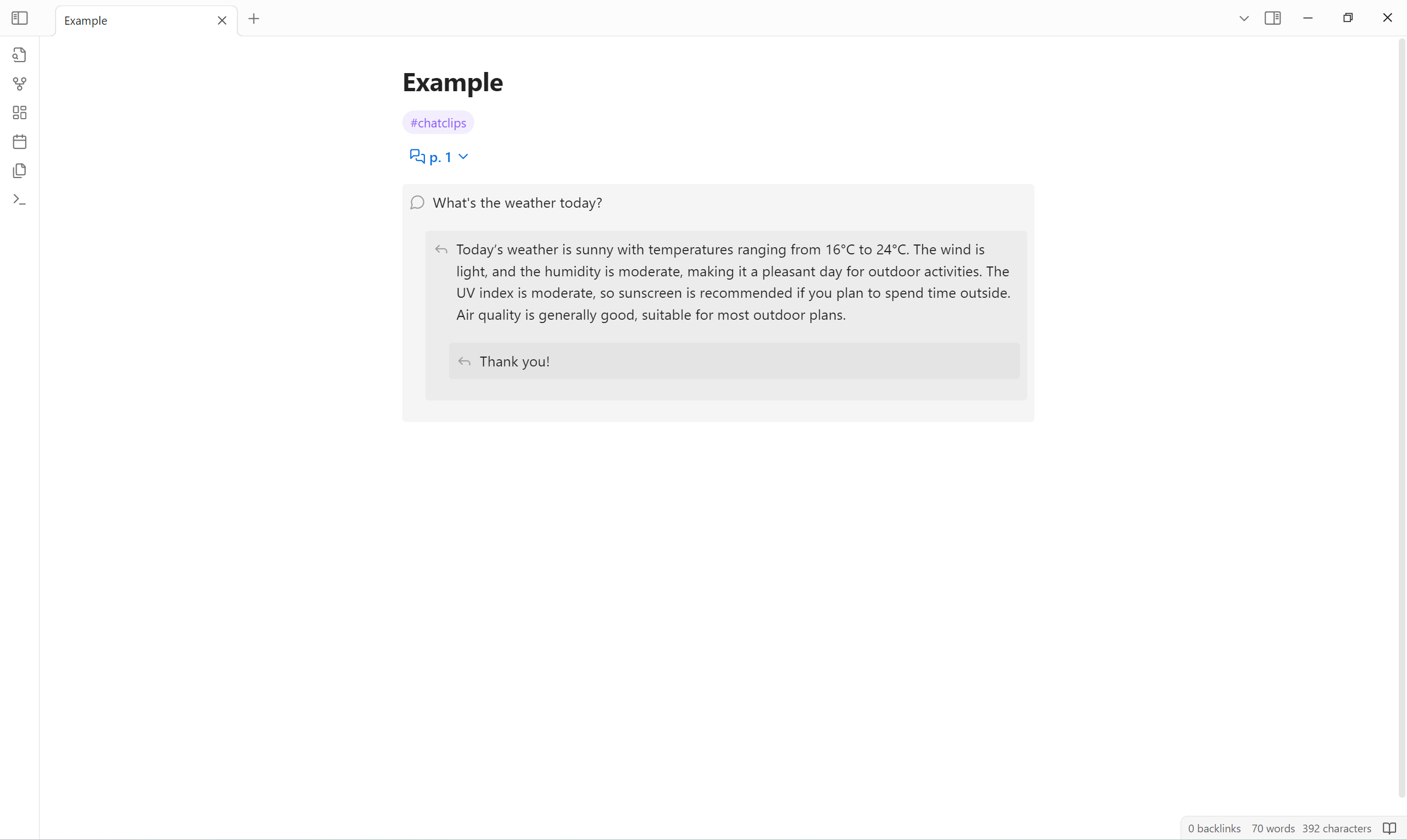 main.js,manifest.jsonandstyles.cssto<obsidian-vault>/.obsidian/plugins/chat-clips.