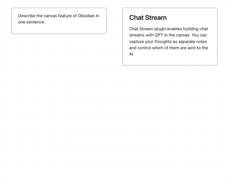 An Obsidian plugin for conversing with GPT AI via canvas notes. Ancestor notes/files are included in the chat context. You can quickly create chat streams, and control what other notes are sent to the AI.