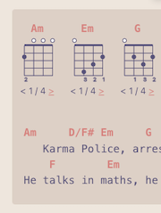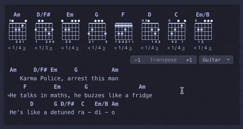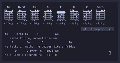 Render and work with chord sheets (chords over lyrics or inline chords in brackets) in your vault. This plugin brings UltimateGuitar-like functionality into Obsidian, featuring chord diagrams, support for guitar, ukulele and mandolin, transposition, and autoscroll. Works seamlessly in edit / live preview and reading mode. It integrates with your theme colors and is customizable to your needs.