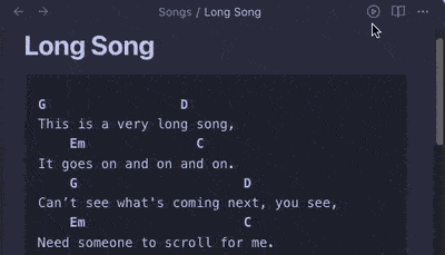 Work with chord sheets (chords over lyrics or inline) in Live Preview and reading mode: Chord diagrams for guitar, ukulele and mandolin, transpose, autoscroll, and more.