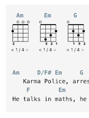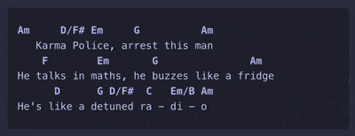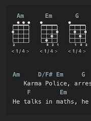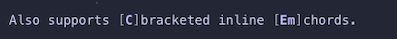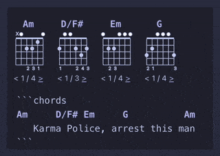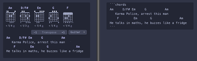 - Renders chords in the ChordPro-inspired markdown-it-chords (bracketed chords in lyrics) format in fenced code blocks