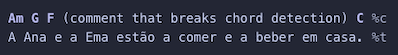 The plugin auto-detects chord and lyric lines. If it fails, add %c at the end of chord lines or %t for lyrics (an idea