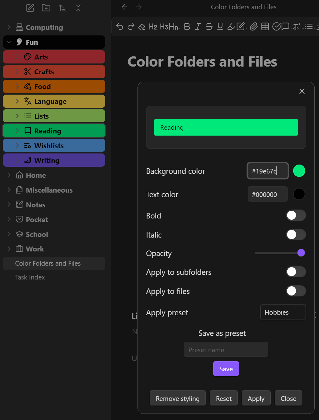 Customize the appearance of folders and files in Obsidian through an easy-to-use context menu with color picker and style options.