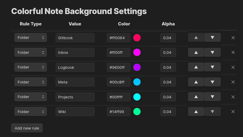 For best result, use subtle colors with low alpha values to avoid overpowering note content. This can guide you through your vault by letting you subtly recognize note types without distractions.