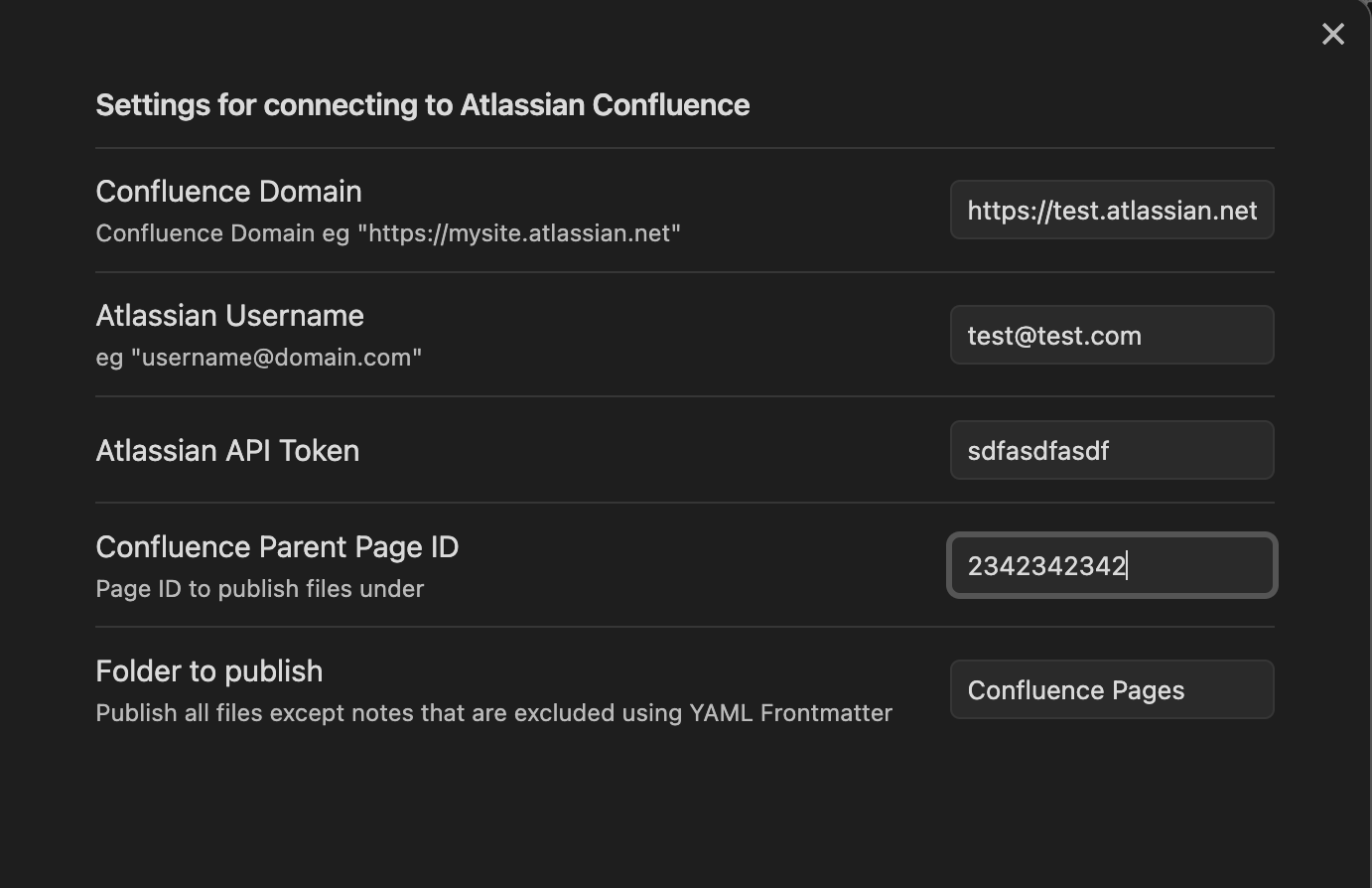 Confluence Base URL: The base URL of your Atlassian Confluence instance (e.g.,https://your-domain.atlassian.net)Confluence Parent Id: The Confluence page ID where your notes will be published as child pagesAtlassian User Name: Your Atlassian account's email addressAtlassian API Token: Your Atlassian API token. You can generate one from your Atlassian Account Settings.Folder To Publish: The name of the folder in Obsidian containing the notes you want to publish (default: "Confluence Pages")