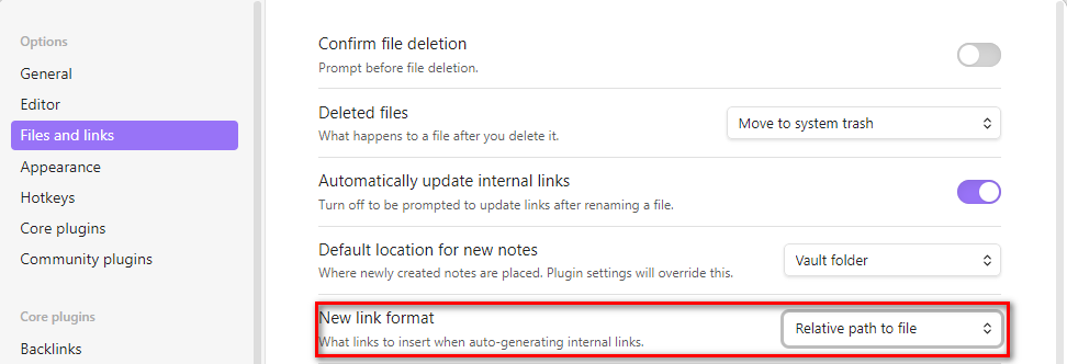 New link formattoRelative path to filemakes your vault more compatible with other markdown editors.