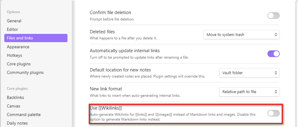 The following Obsidian settings are not mandatory but can improve performance and interoperability of your vault.