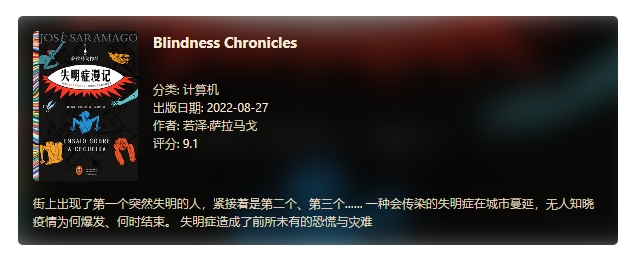 街上出现了第一个突然失明的人,紧接着是第二个、第三个…… 一种会传染的失明症在城市蔓延,无人知晓疫情为何爆发、何时结束。 失明症造成了前所未有的恐慌与灾难
