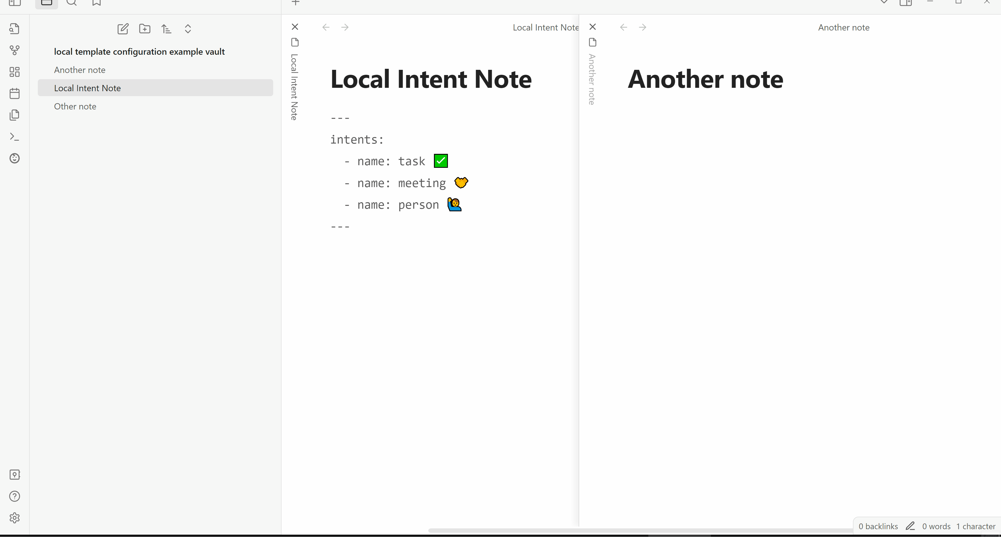Intents group together templates and are the core unit of configuration in this plugin. They represent the different intents for creating a note. Eg: "I intend to create a meeting note".