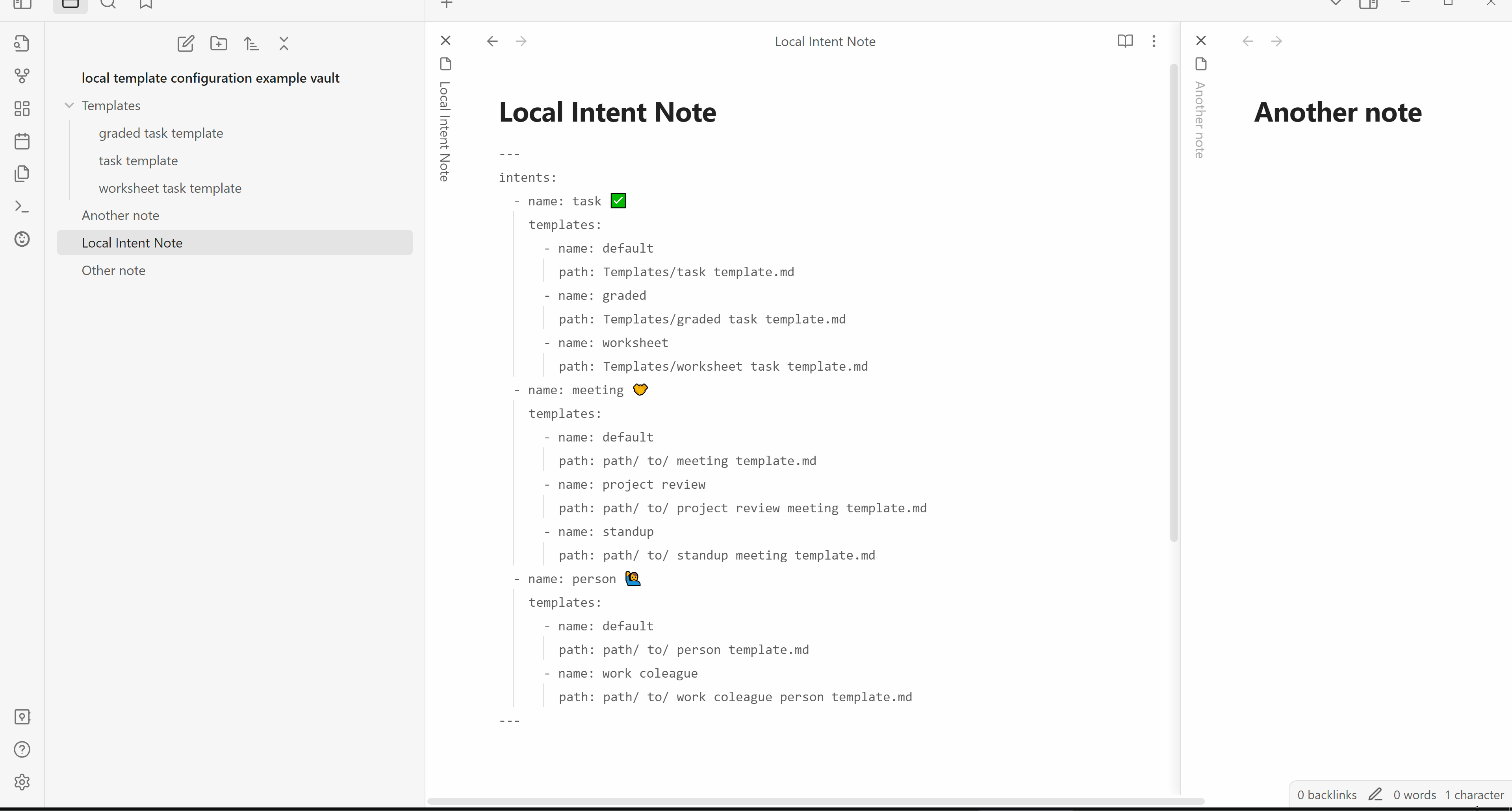 Both intents and templates can have a new note pathname and a list of variables.