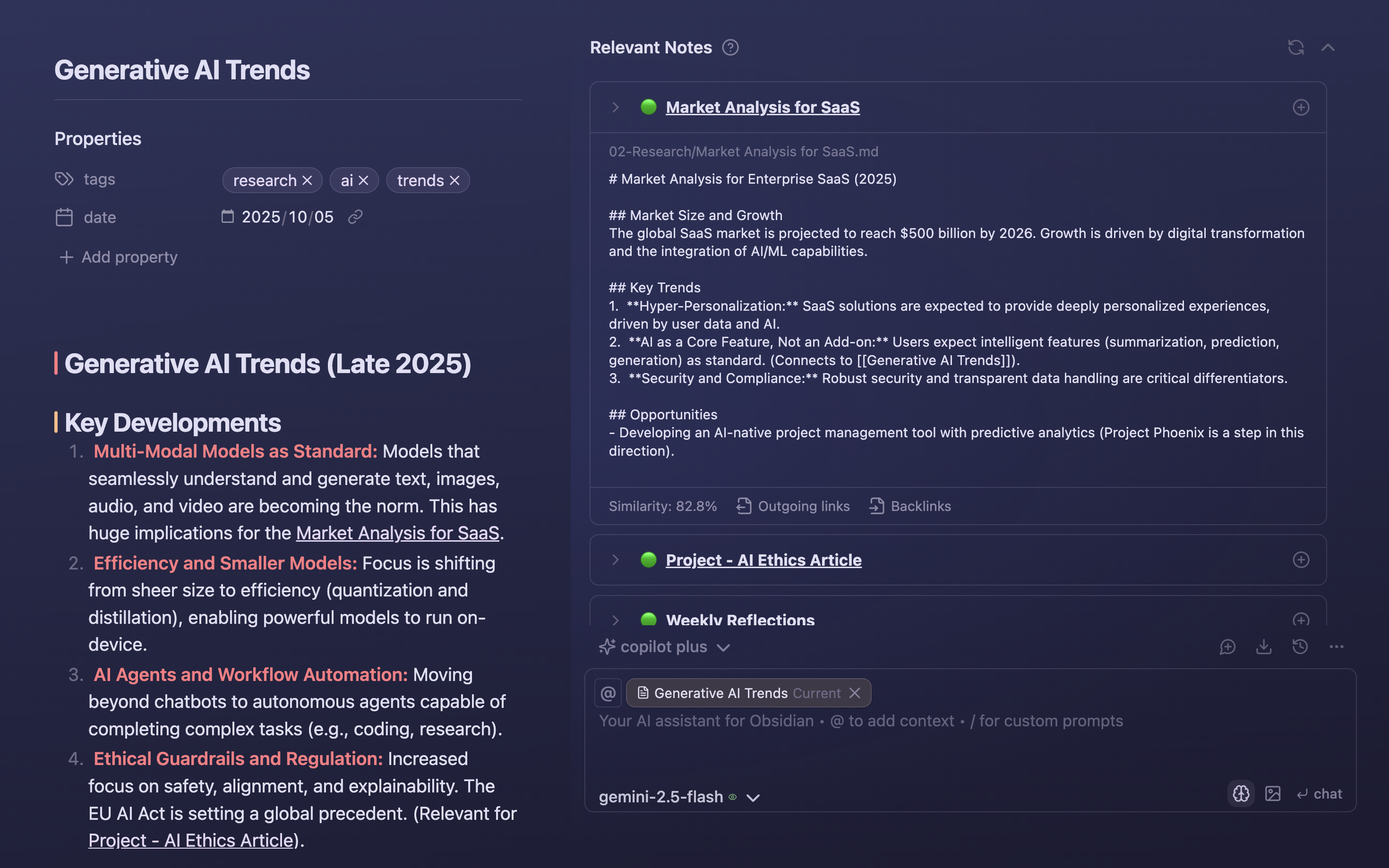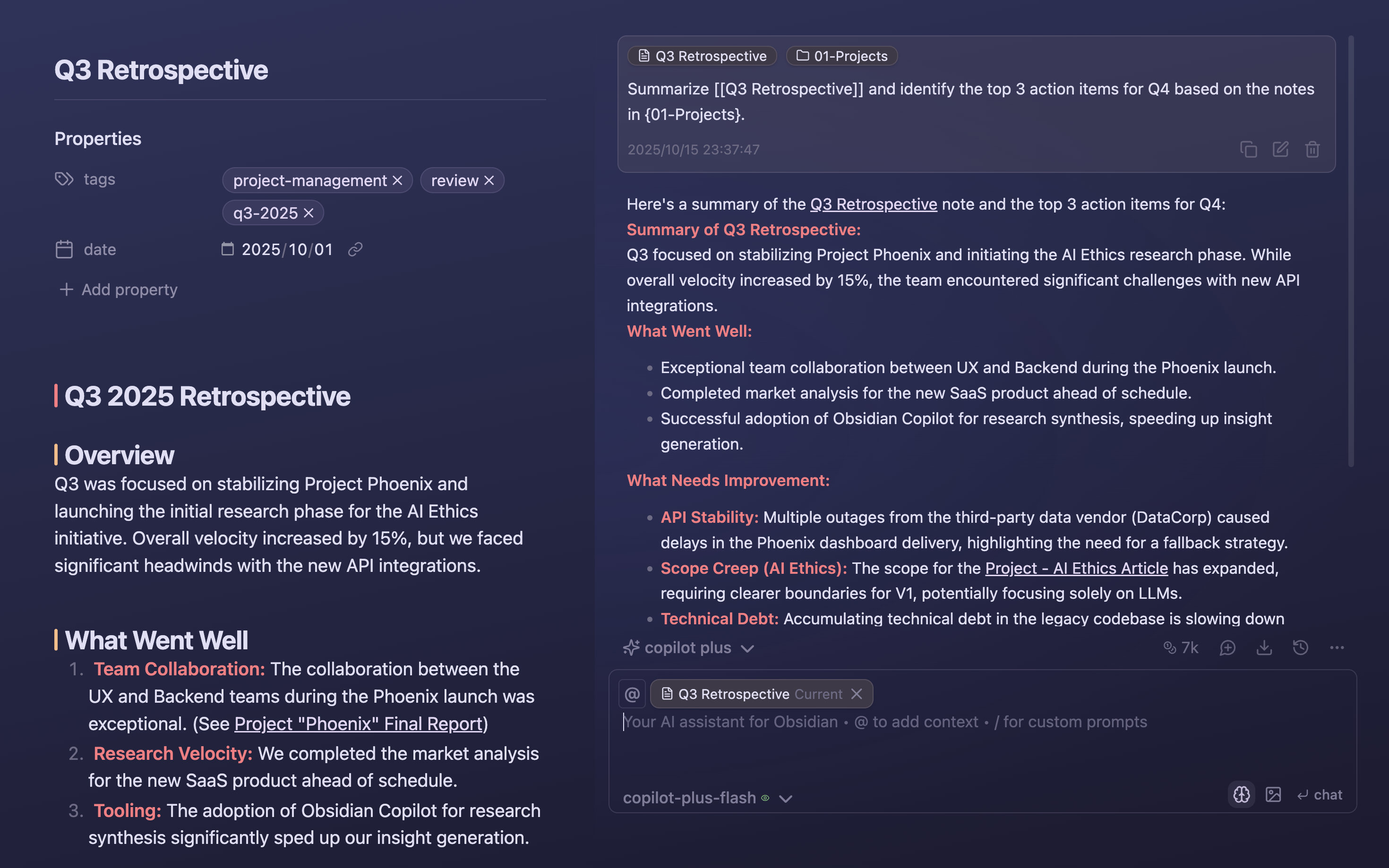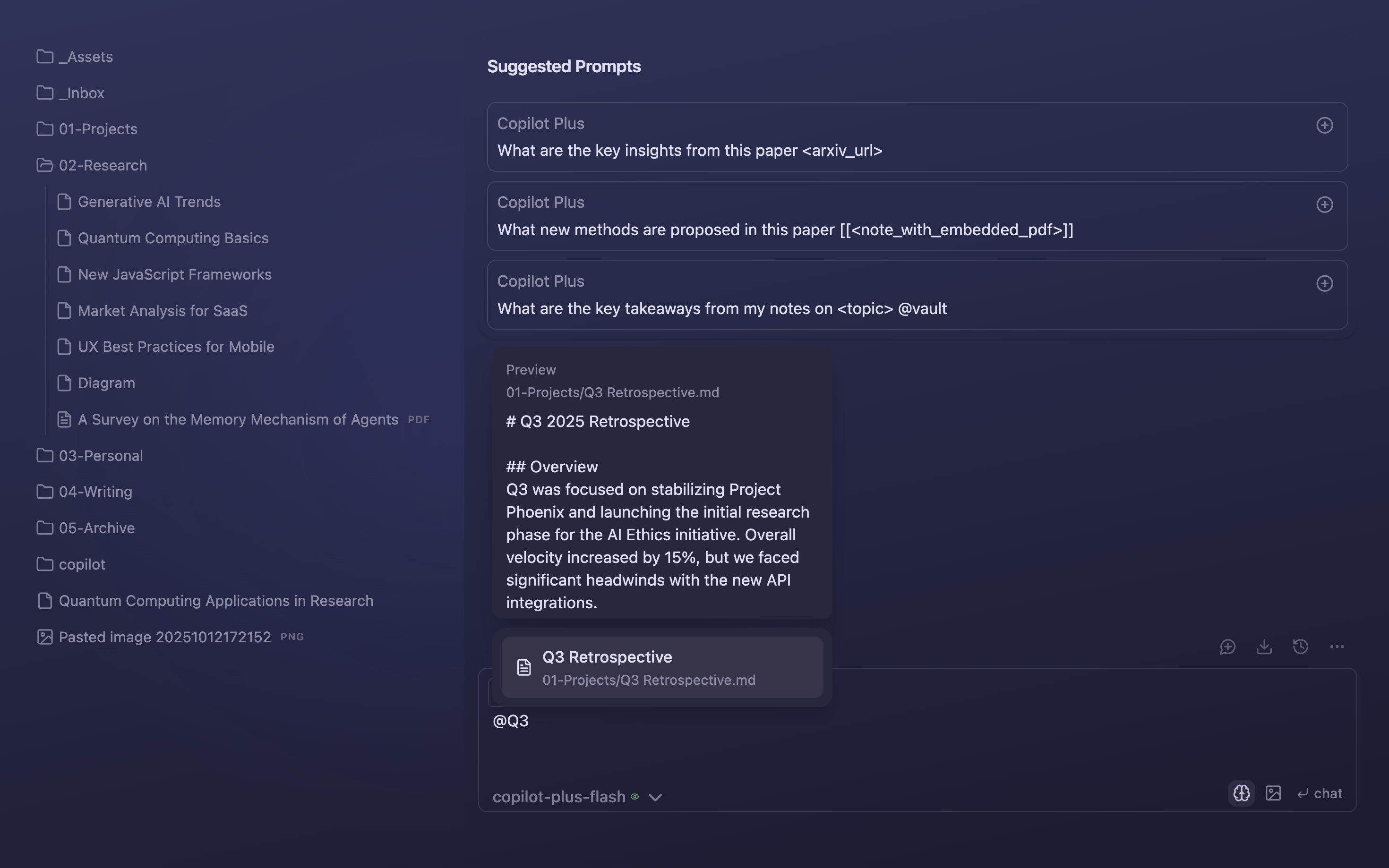 Copilot Plus brings powerful AI agentic capabilities, context-aware actions and seamless tool integration—built to elevate your knowledge work in Obsidian.