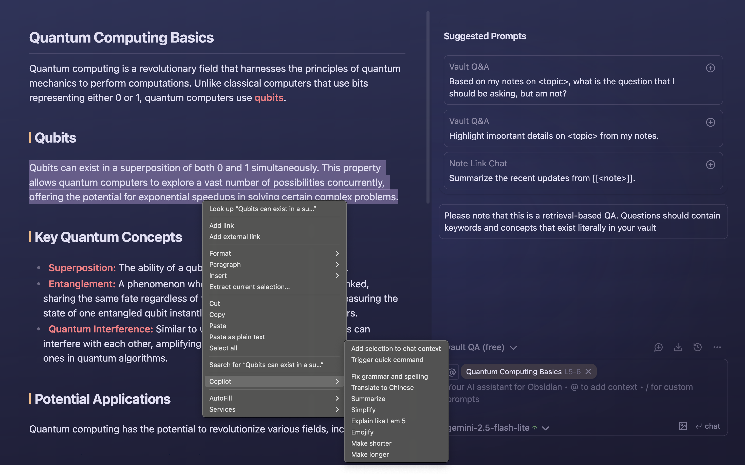 💡 For QA with unlimited context, switch to the Vault QA mode in the dropdown (Copilot v2.1.0+ required).