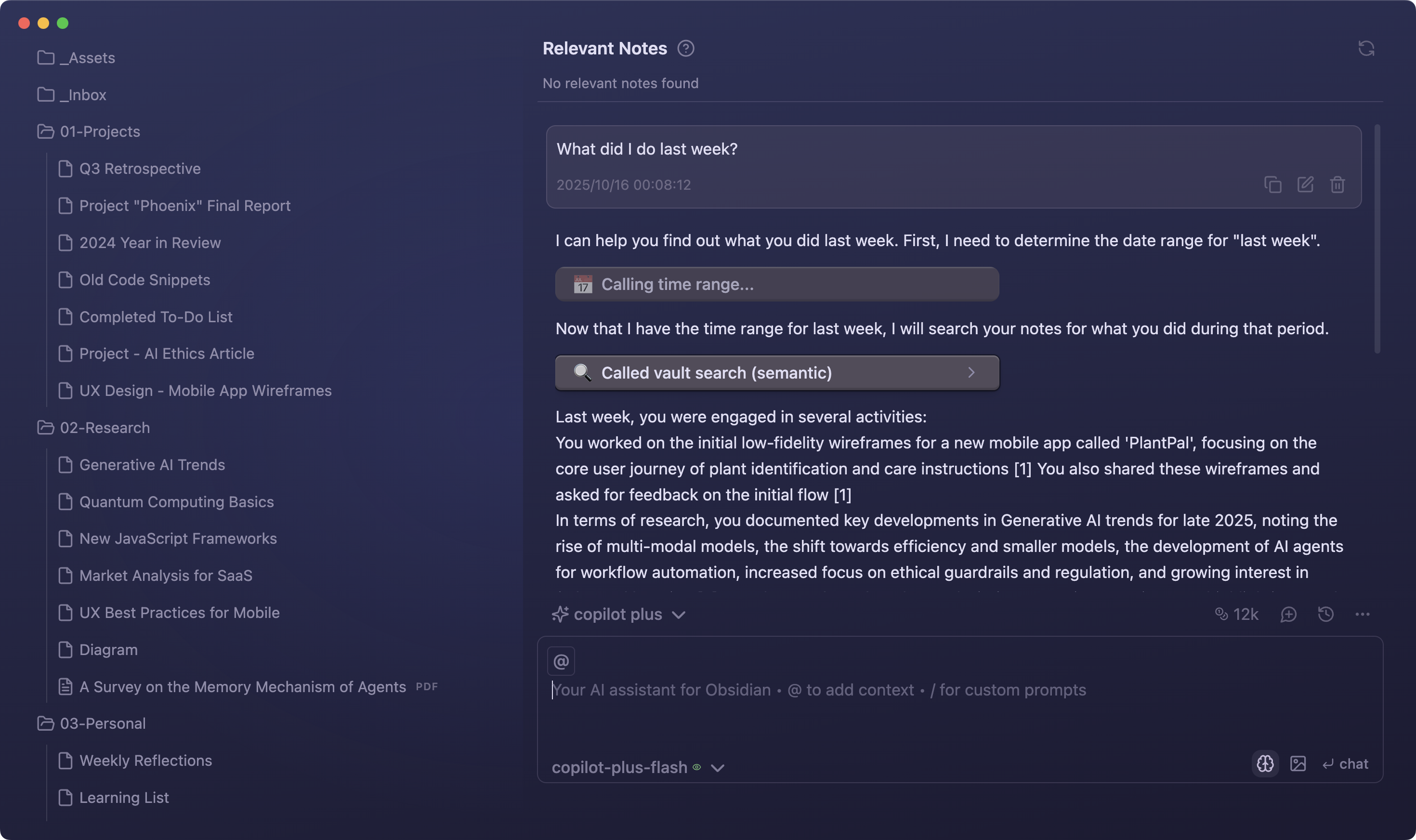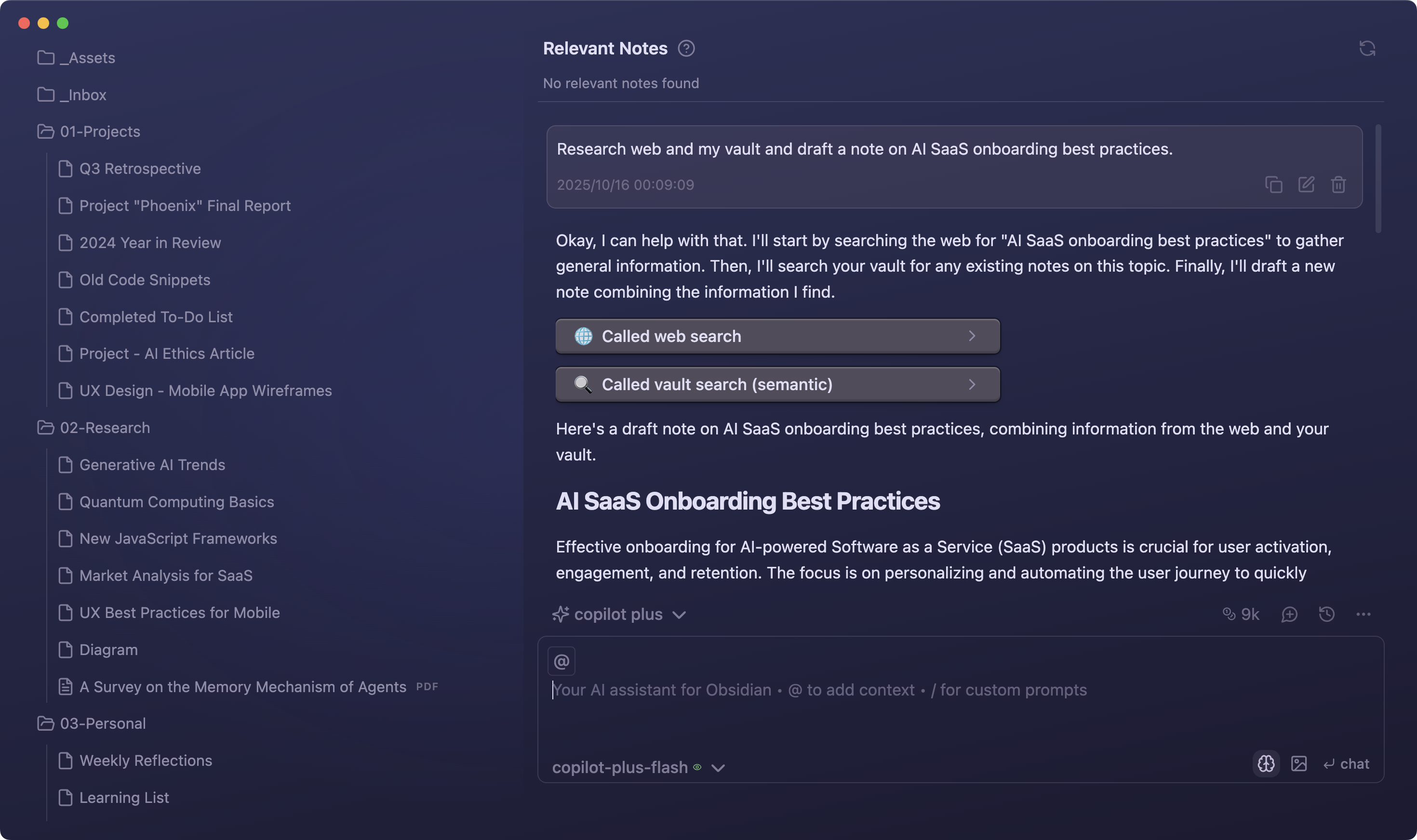 Copilot's agent automatically calls the right tools—no manual commands needed. Just ask, and it searches the web, queries your vault, and combines insights seamlessly.