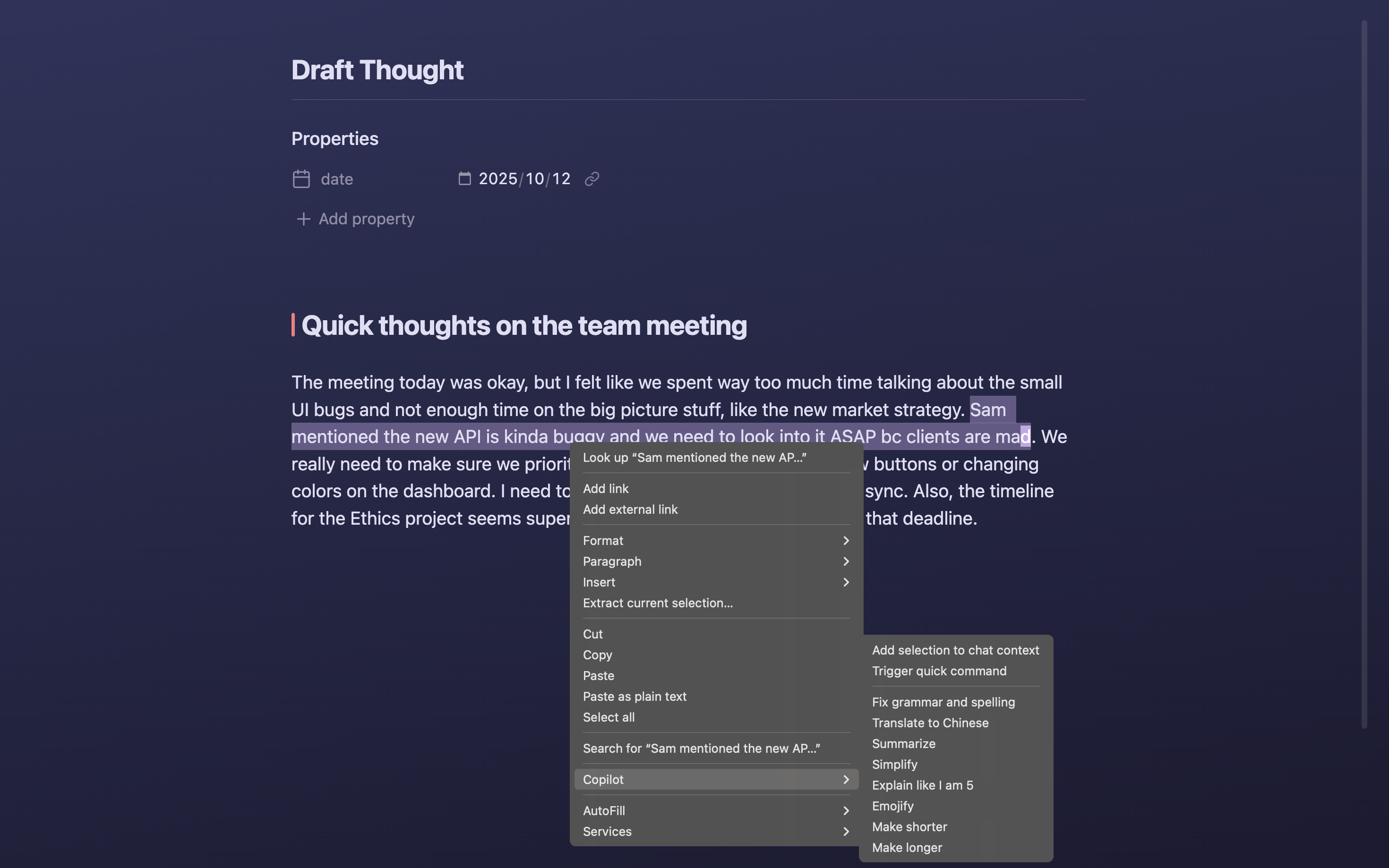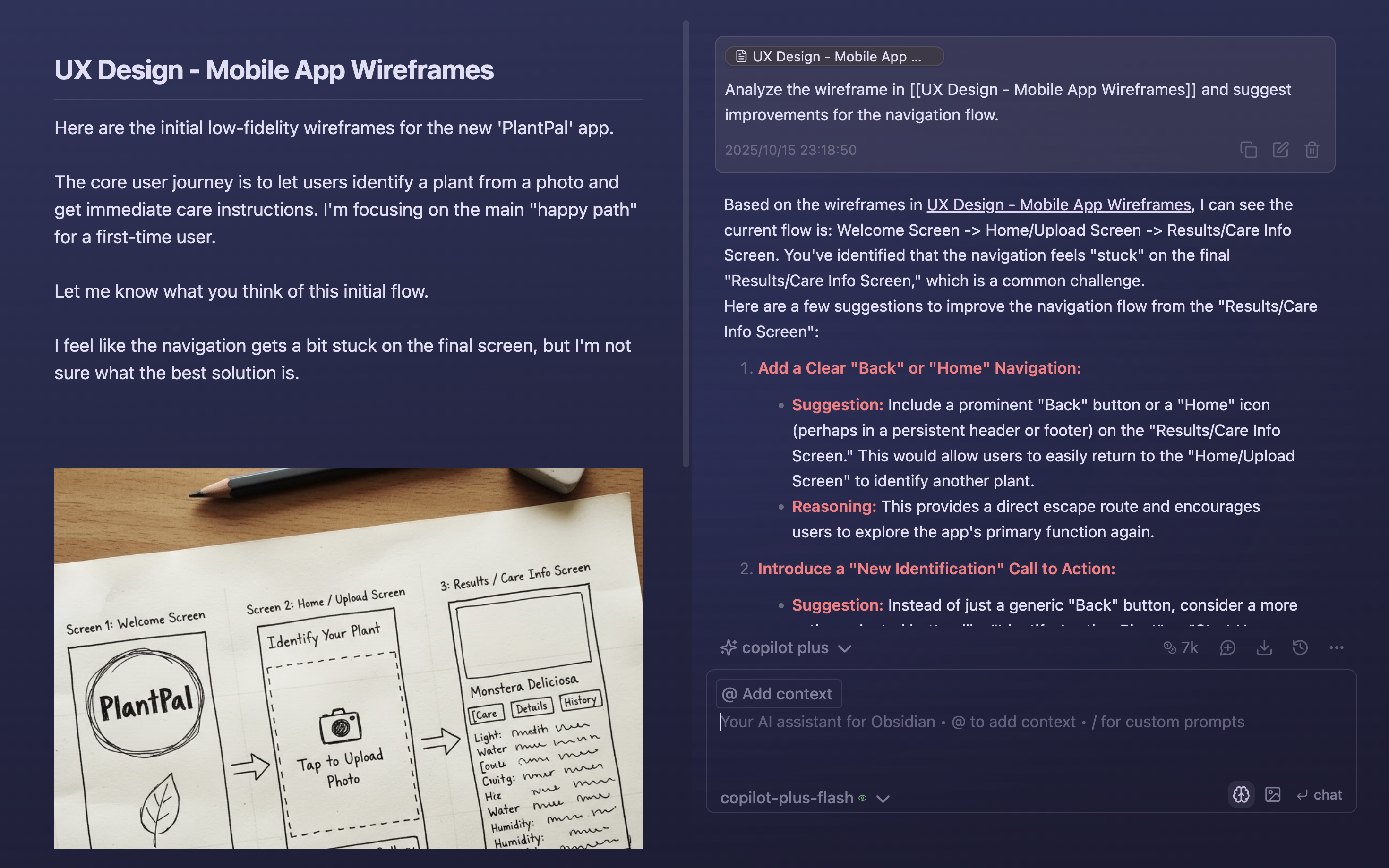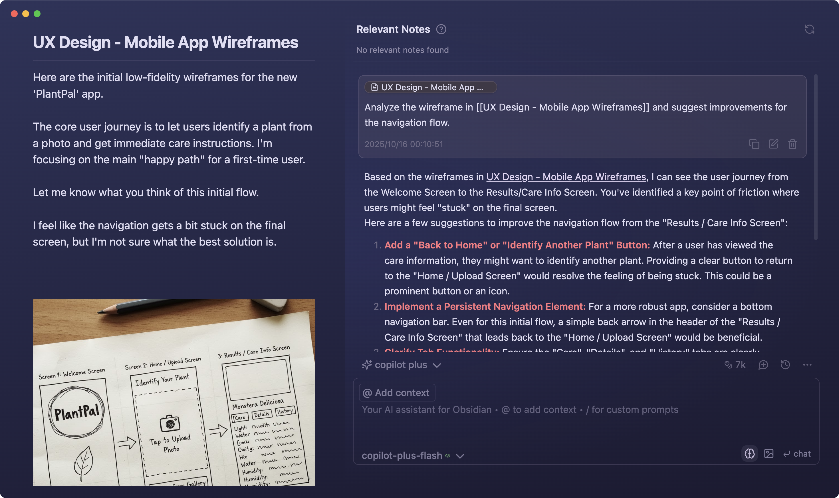 Copilot can analyze images embedded in your notes—from wireframes and diagrams to screenshots and photos. Get detailed feedback, suggestions, and insights based on visual content.