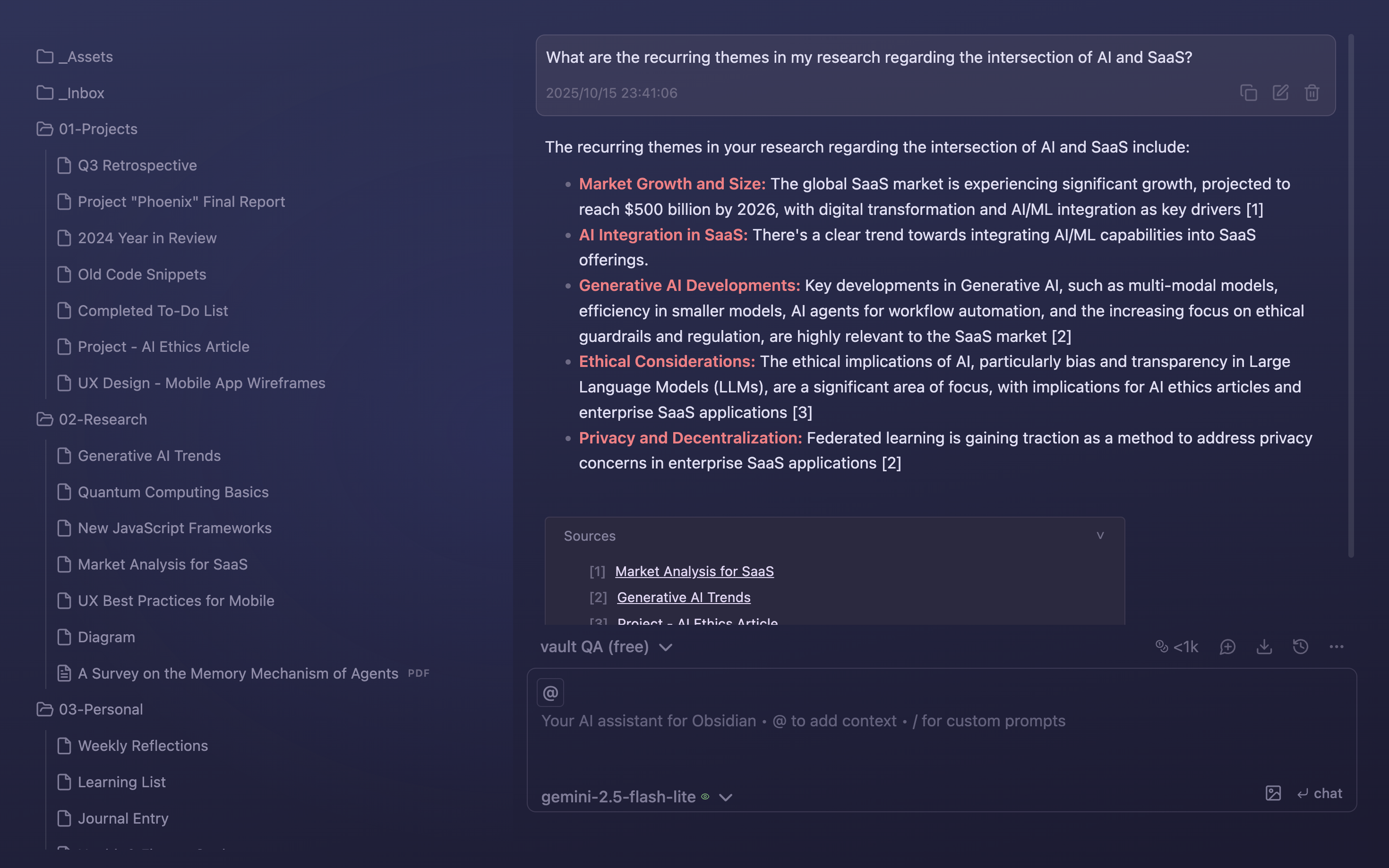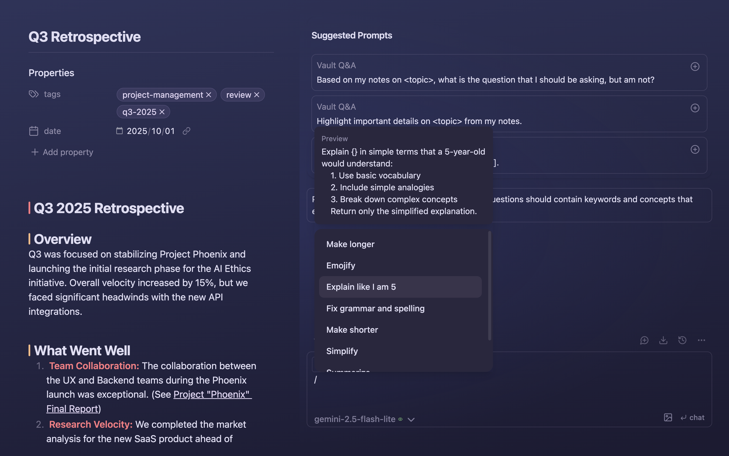 - 🗂️ Project Mode: Create AI-ready context based on folders and tags. Think NotebookLM but inside your vault!