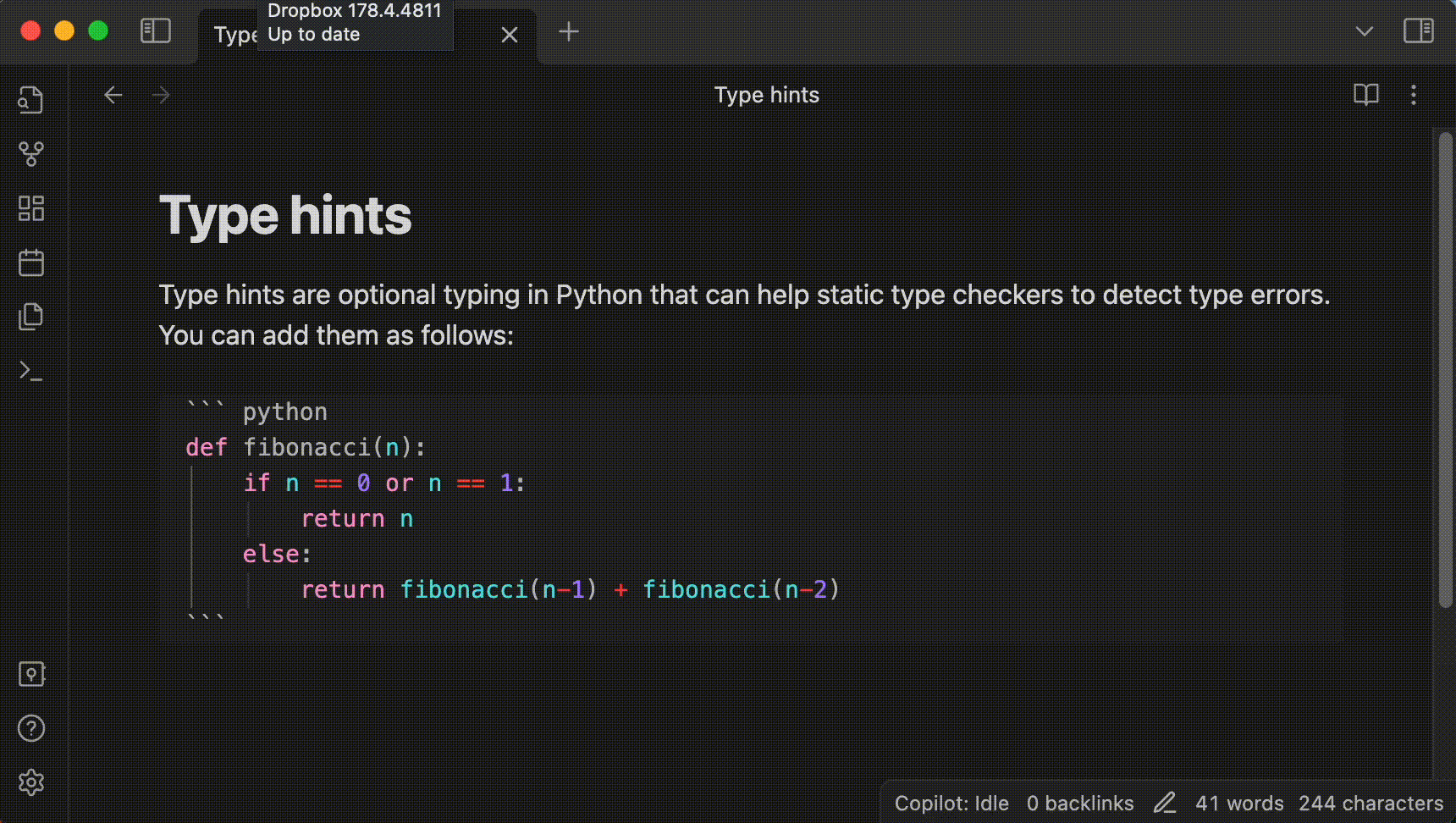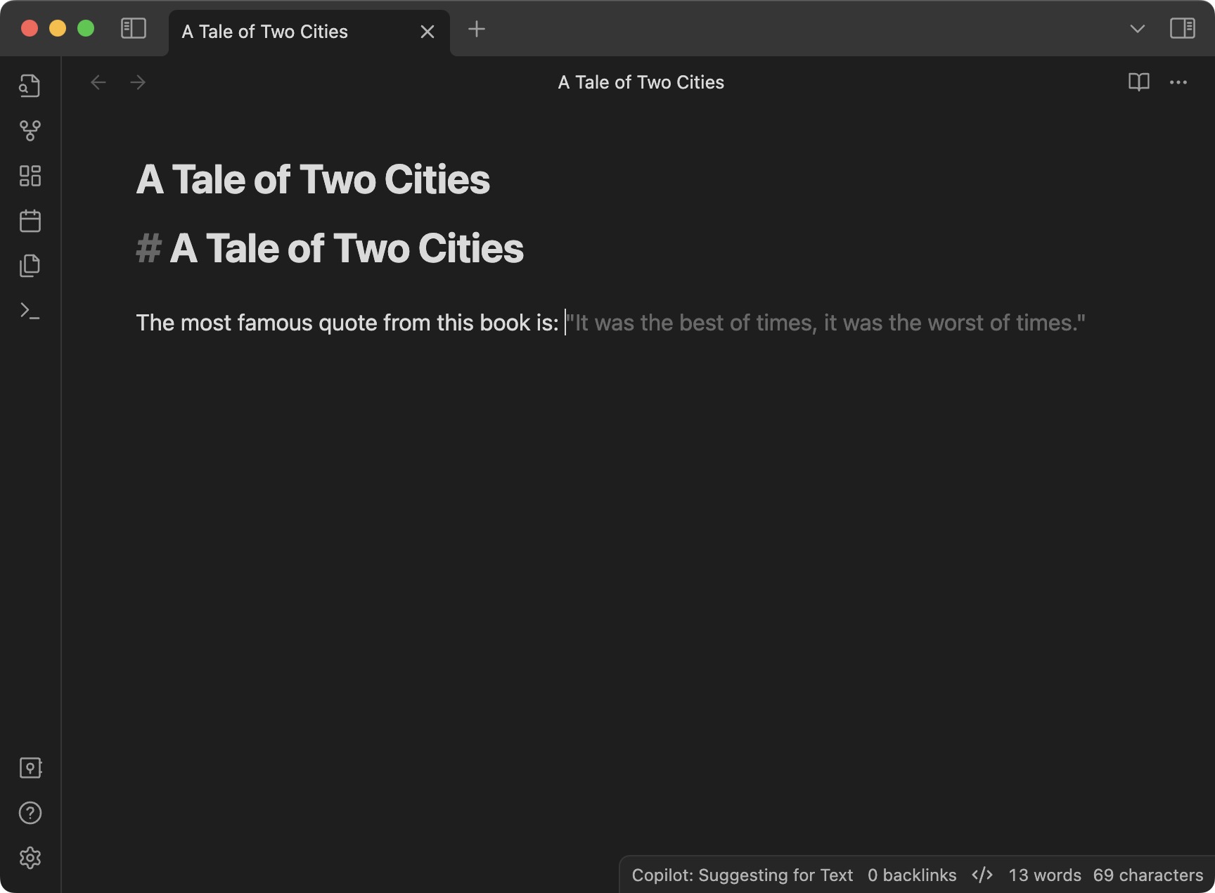 Note: To minimize API calls and costs, this plugin is not as sensitive to triggers as the original Copilot. It only activates after specific triggers, such as end-of-sentence punctuation, a new line, or a list item. For more information, see the triggers documentation.