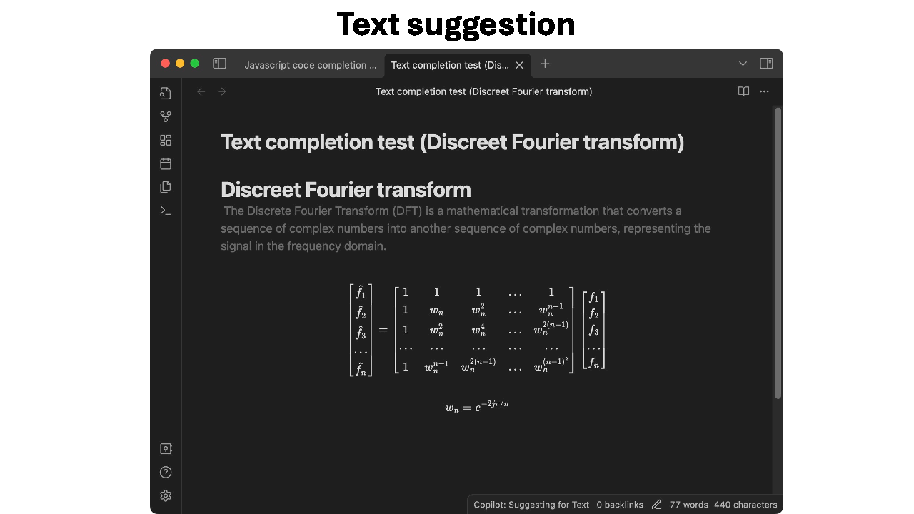 ncharacters before and after your cursor, displaying the proposed text as transparent overlay near your cursor, tailored to fit the current context. Want to know how it works? See the how does the model work in detail? documentation. - Context-Aware Suggestions: The suggestions adapt to the current writing context. For instance, the plugin will offer text suggestions in paragraphs, code in code blocks, and LaTeX formulas in math blocks, among others. Want to know how it does this? See the context aware few shot examples documentation.