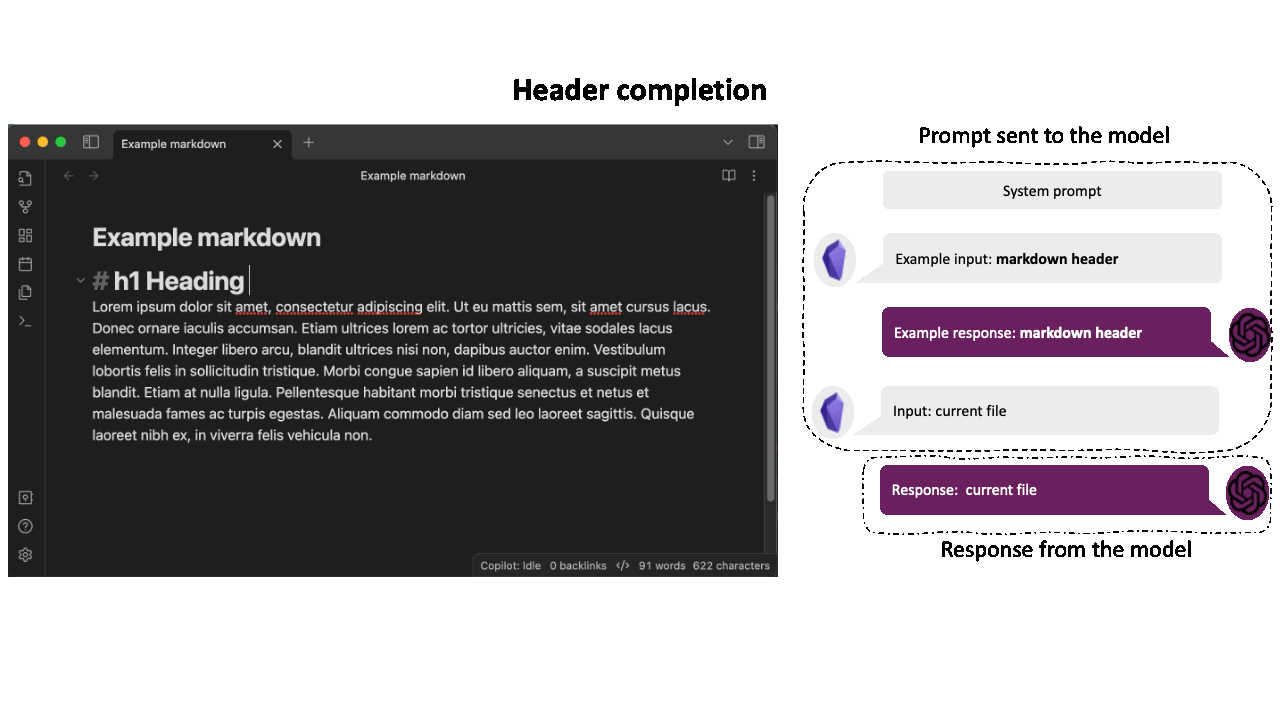 In addition to the system prompt, we provide the model with context-specific examples to enhance its performance and make it more context-aware. For instance, if the cursor is within a code block, we supply code-related examples to the model. Conversely, if the cursor is in a title, we offer title-related examples. This approach informs the model of our expectations for the response in the given context. The plugin accommodates a wide array of contexts, including code blocks, math blocks, lists, headings, paragraphs, and more. These few-shot examples are customizable, allowing you to tailor them to your writing style or language preferences (see Custom Few-Shot Examples for more information).
