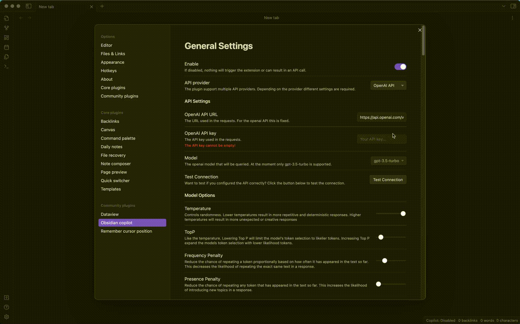 Obsidian Copilot: Disablecommand. This allows you to disable the plugin when working on sensitive documents or when you are currently not in need of suggestions.
