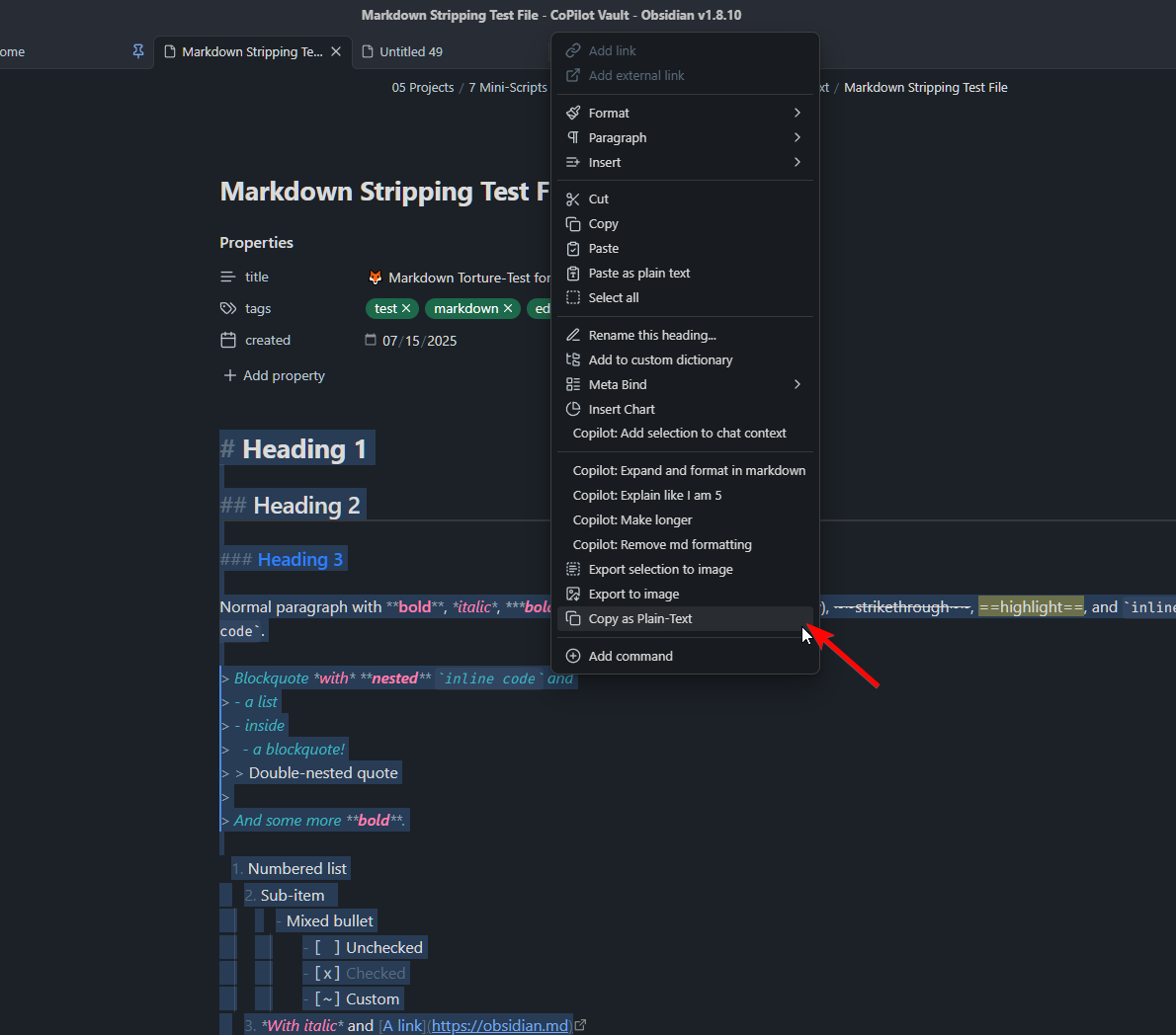 - Right-click → Copy as Plain-Text, or open the Command Palette (Ctrl/Cmd+P) → Copy as Plain-Text.