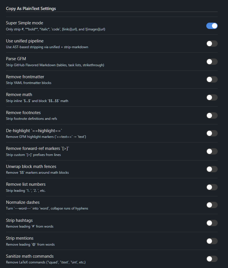 - Super Simple mode for minimal regex stripping, ideal for quick, predictable plain-text