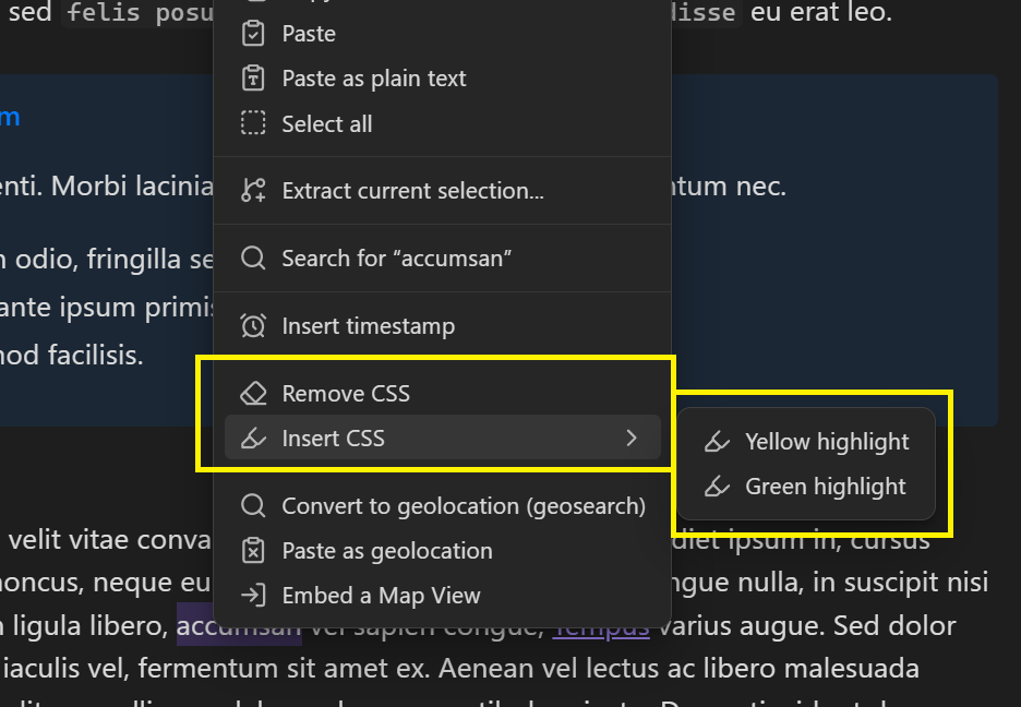 - Right-click the note (on desktop) or perform the command Show context menu under cursor to open the Context menu. Enabled snippets will appear there. Select Insert CSS and then the snippet you want to apply, or select Remove CSS to remove the applied CSS snippet.