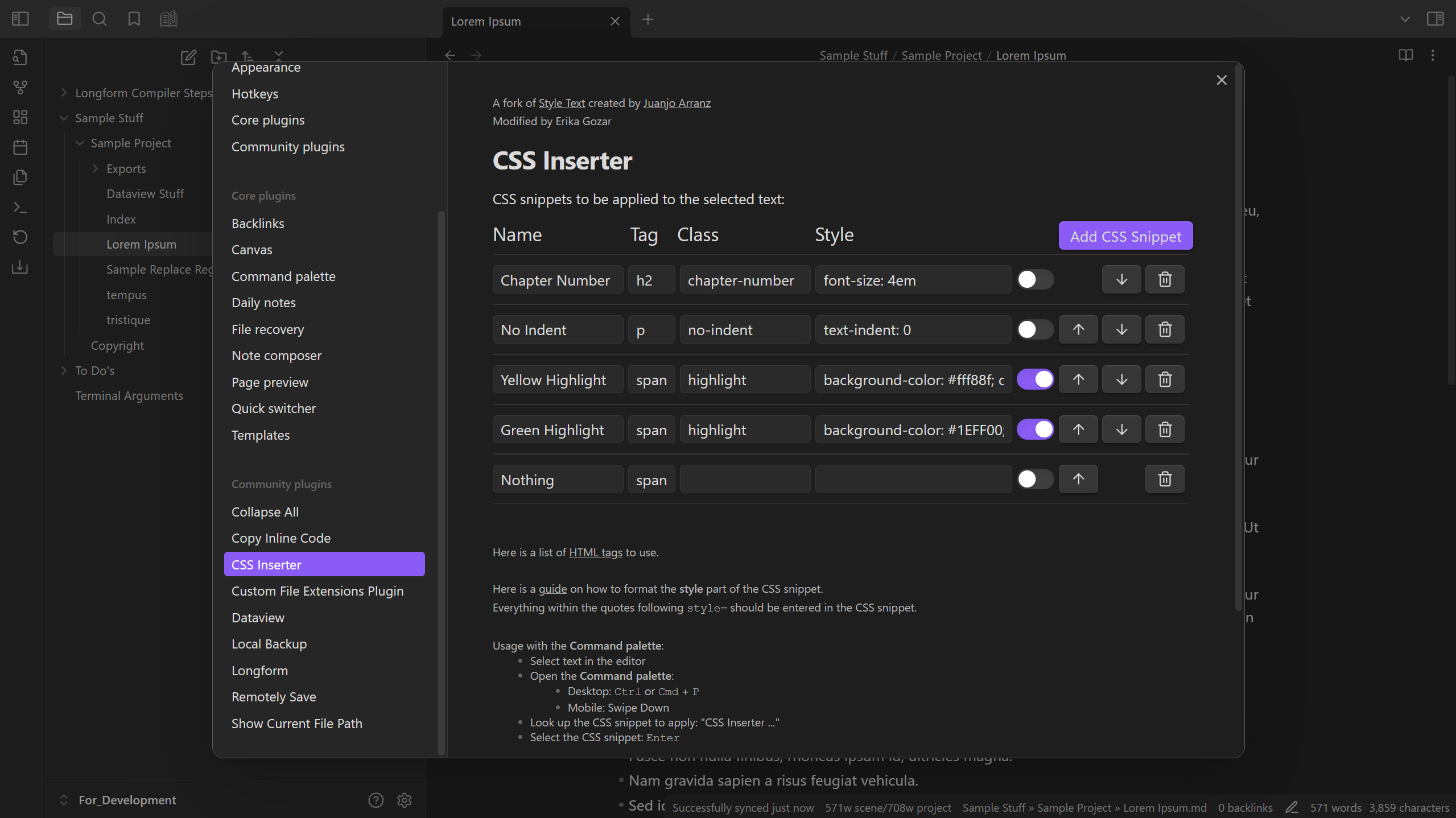 - Open the Command palette and search for and select the CSS style you'd like to apply, or perform the CSS Inserter: Remove CSS command to remove the CSS snippet (see Command palette).
