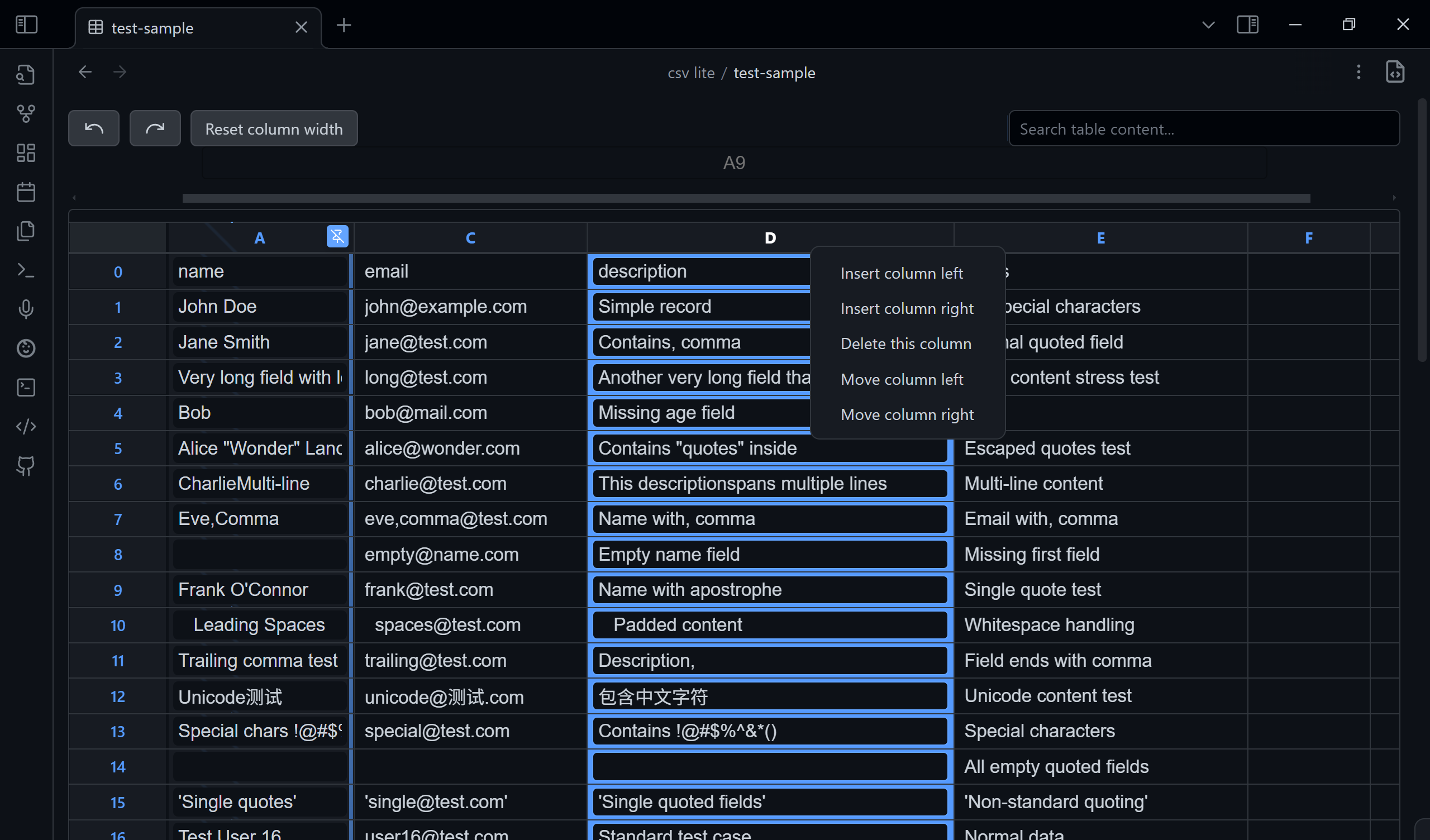 .csvfile. A unique name likenew.csvornew-1.csvwill be generated automatically. - Switch Delimiter Non‑Destructively: Auto‑detects the file delimiter (comma, semicolon, tab, etc.). Changing the delimiter in the toolbar only re-parses the view; it does NOT rewrite your file. Your original delimiter is preserved when saving edits.