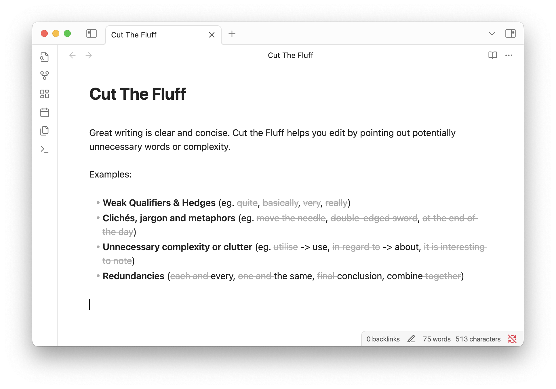Great writing is clear and concise. Cut the Fluff helps you edit by pointing out potentially unnecessary words or complexity.
