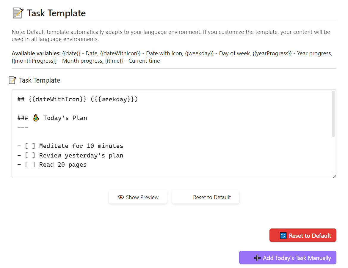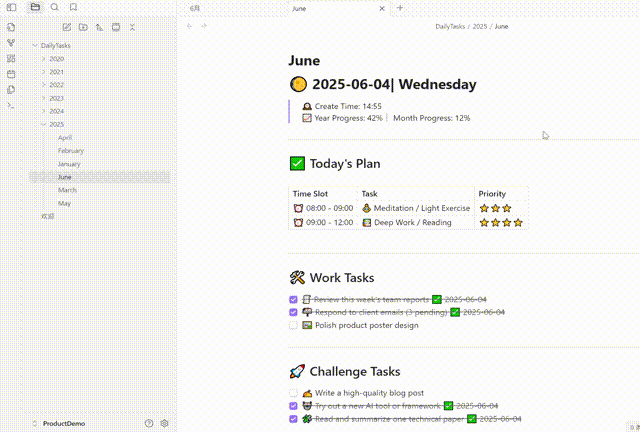 - 🤖 自动生成: 根据您的首选计划(每天或仅工作日)自动创建每日任务笔记