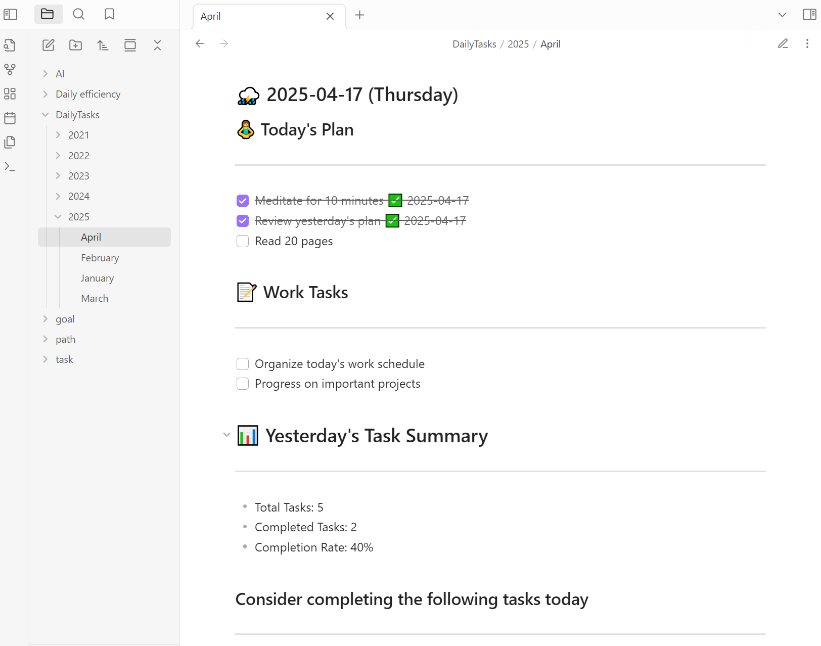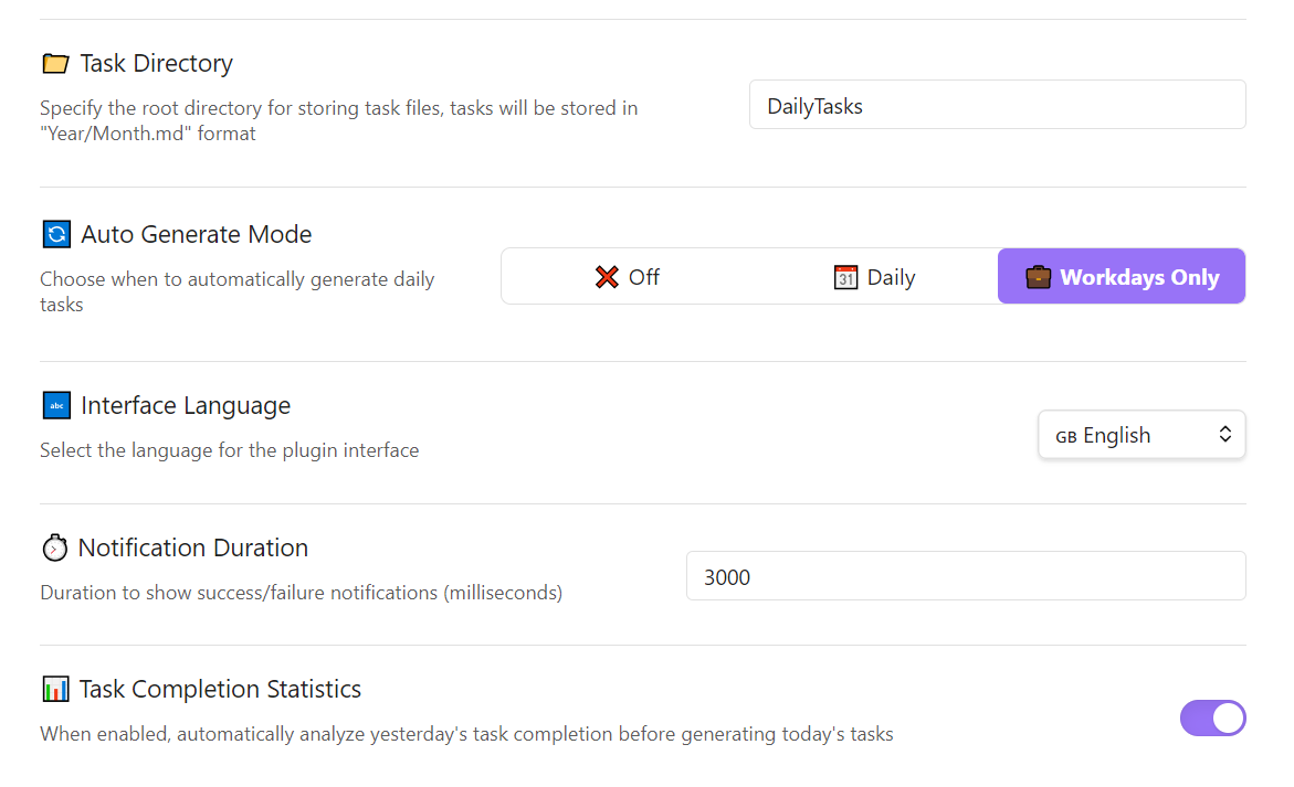 - 🤖 Automatic Generation: Automatically creates daily task notes based on your preferred schedule (daily or workdays only)