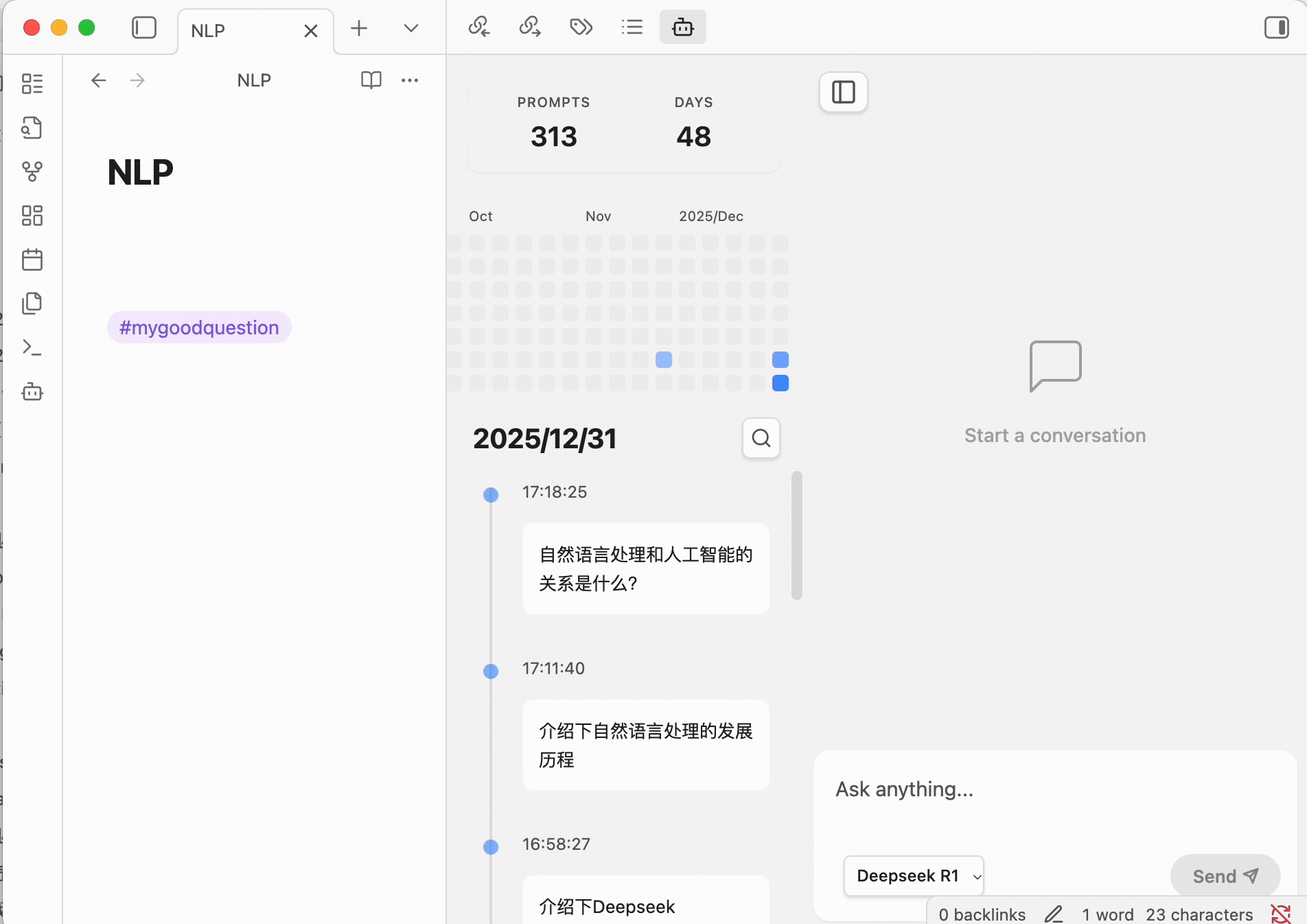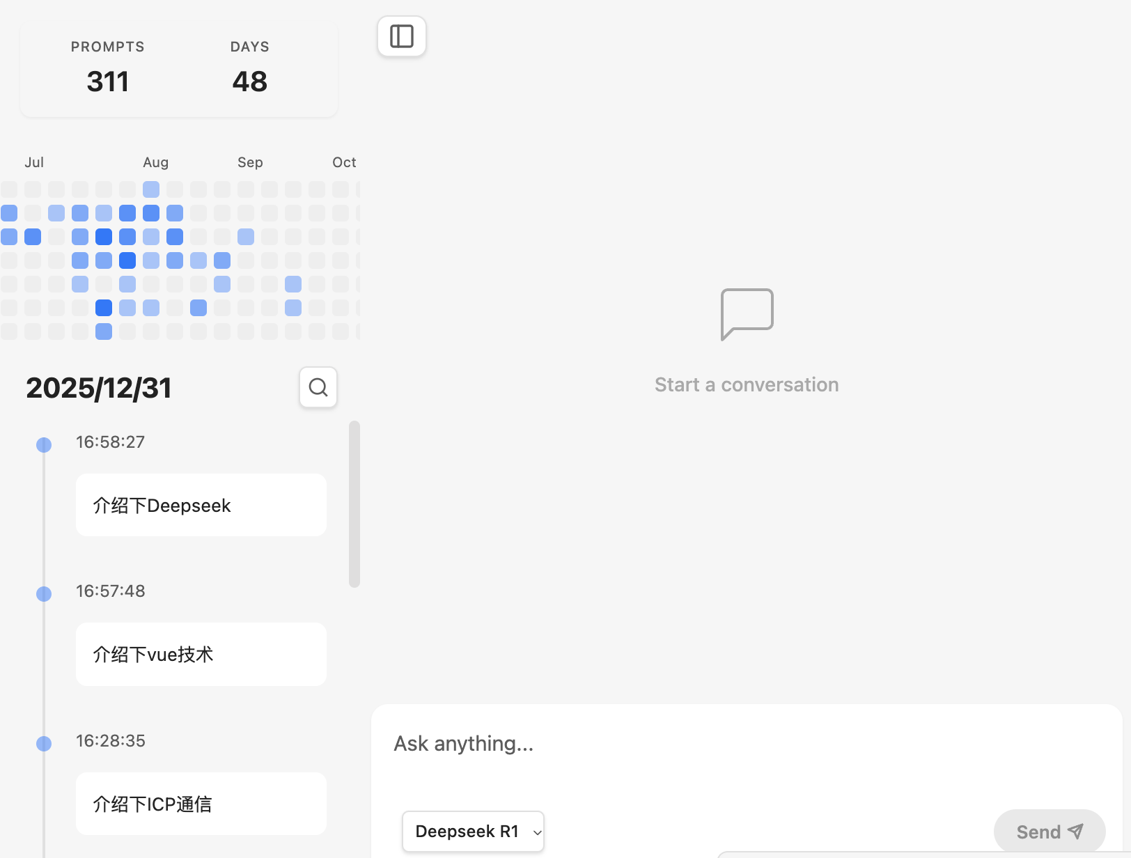 内置热力图功能,展示近期的提问频率。这可以作为一种轻量级的学习轨迹参考,帮助您了解自己的关注点变化。